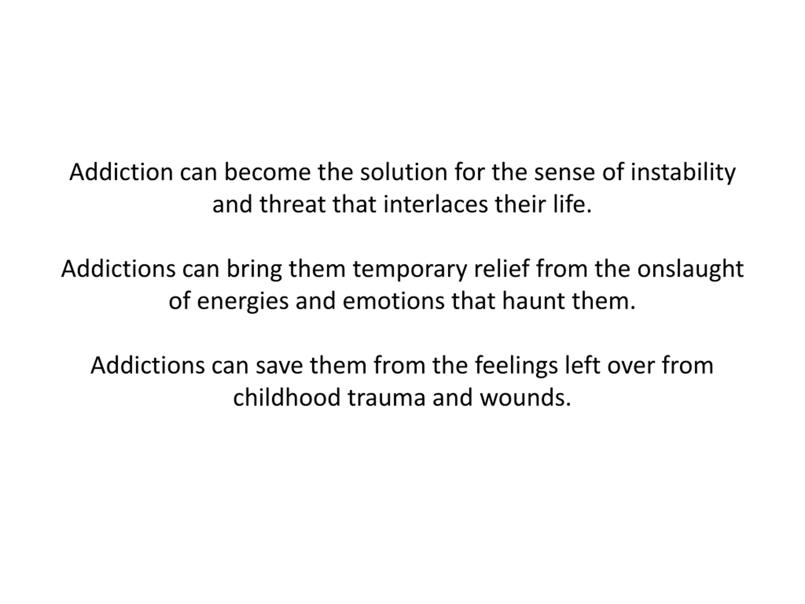 Addiction can become the solution for the sense of instability and threat that interlaces their life. Addictions can bring them temporary relief from the onslaught of energies and emotions that haunt them. Addictions can save them from the feelings left over from childhood trauma and wounds.
