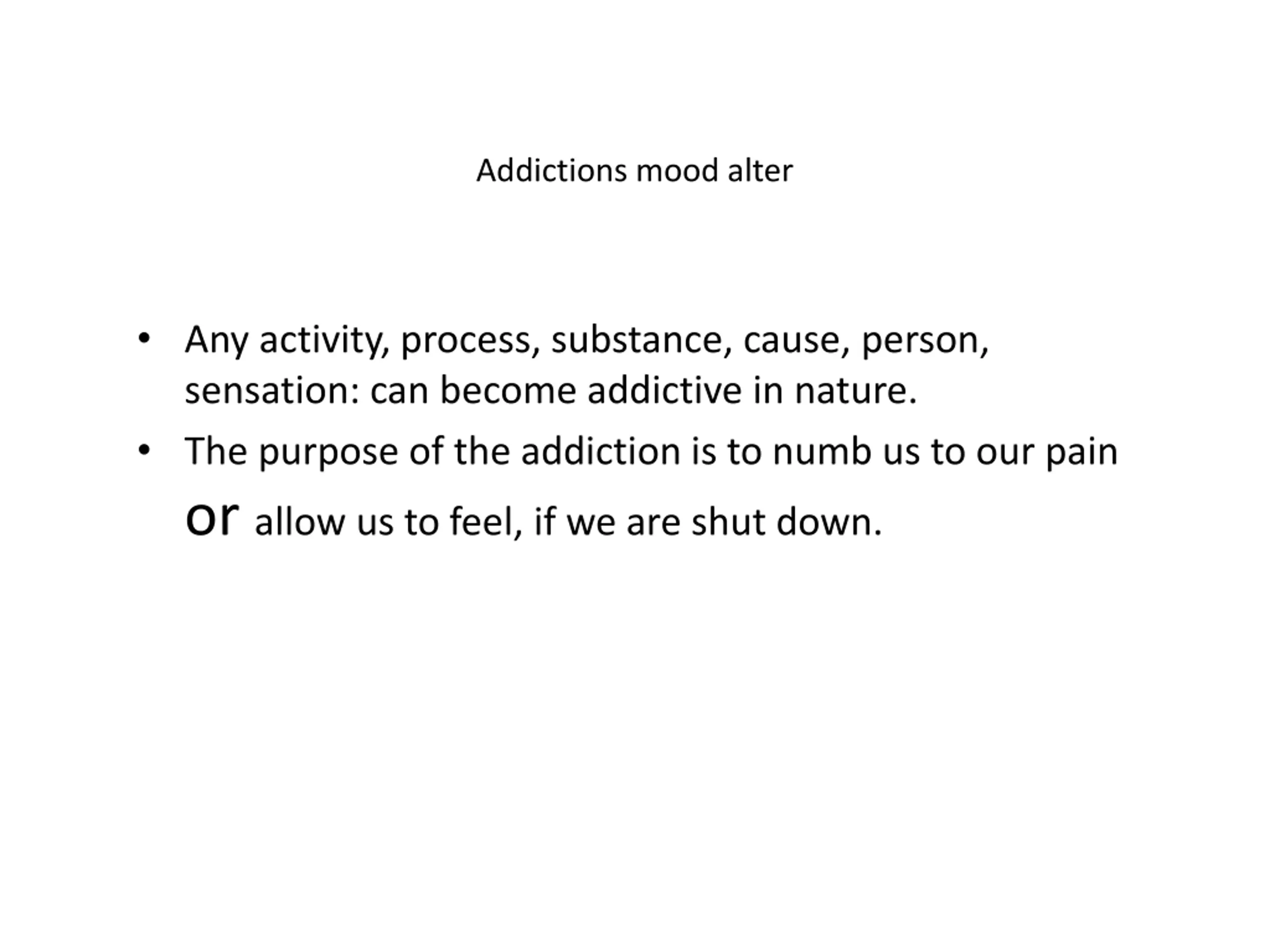 Addictions mood alter Any activity, process, substance, cause, person, sensation: can become addictive in nature. The purpose of the addiction is to numb us to our pain or allow us to feel, if we are shut down.