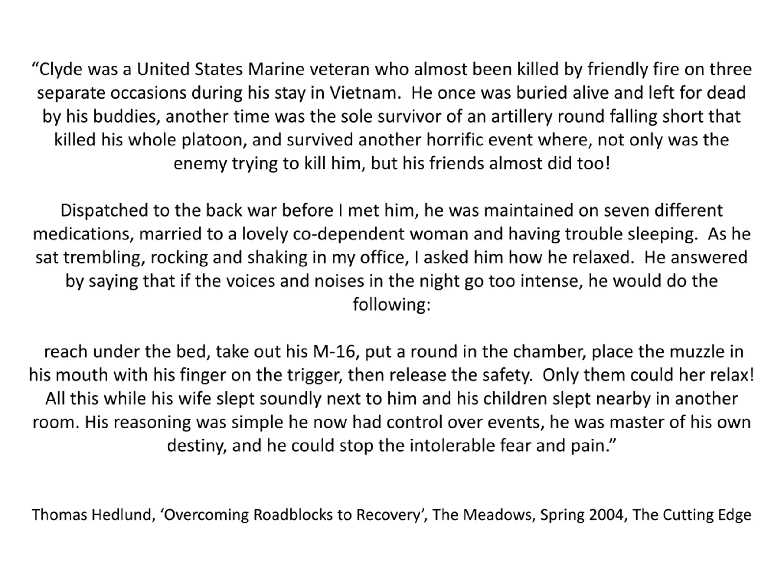 Clyde was a United States Marine veteran who almost been killed by friendly fire on three separate occasions during his stay in Vietnam. He once was buried alive and left for dead by his buddies, another time was the sole survivor of an artillery round falling short that killed his whole platoon, and survived another horrific event where, not only was the enemy trying to kill him, but his friends almost did too! Dispatched to the back war before I met him, he was maintained on seven different medications, married to a lovely co-dependent woman and having trouble sleeping. As he sat trembling, rocking and shaking in my office, I asked him how he relaxed. He answered by saying that if the voices and noises in the night go too intense, he would do the following: reach under the bed, take out his M-16, put a round in the chamber, place the muzzle in his mouth with his finger on the trigger, then release the safety. Only them could her relax! All this while his wife slept soundly next to him and his children slept nearby in another room. His reasoning was simple he now had control over events, he was master of his own destiny, and he could stop the intolerable fear and pain. Thomas Hedlund, Overcoming Roadblocks to Recovery , The Meadows, Spring 2004, The Cutting Edge