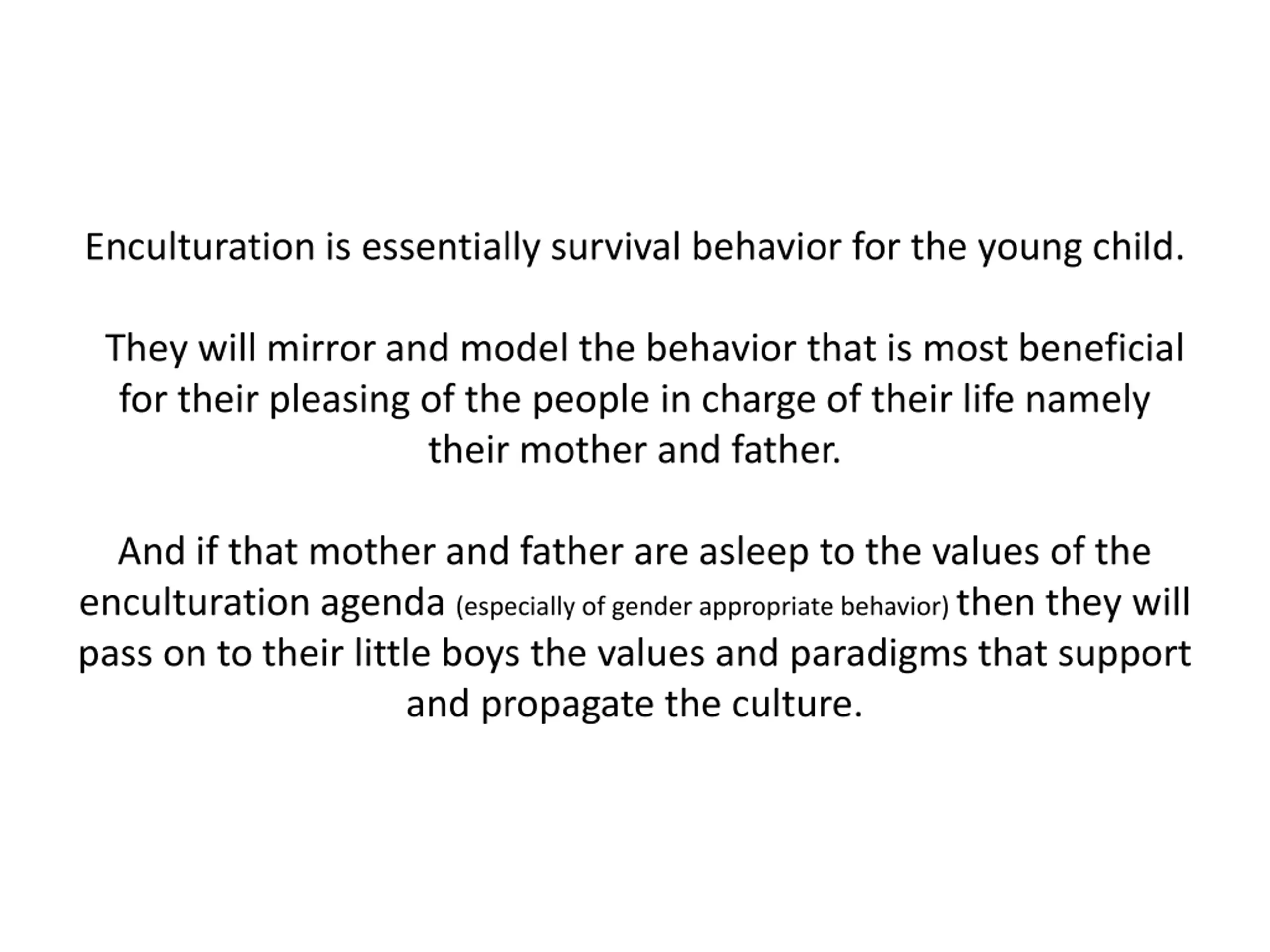 Enculturation is essentially survival behavior for the young child. They will mirror and model the behavior that is most beneficial for their pleasing of the people in charge of their life namely their mother and father. And if that mother and father are asleep to the values of the enculturation agenda (especially of gender appropriate behavior) then they will pass on to their little boys the values and paradigms that support and propagate the culture.