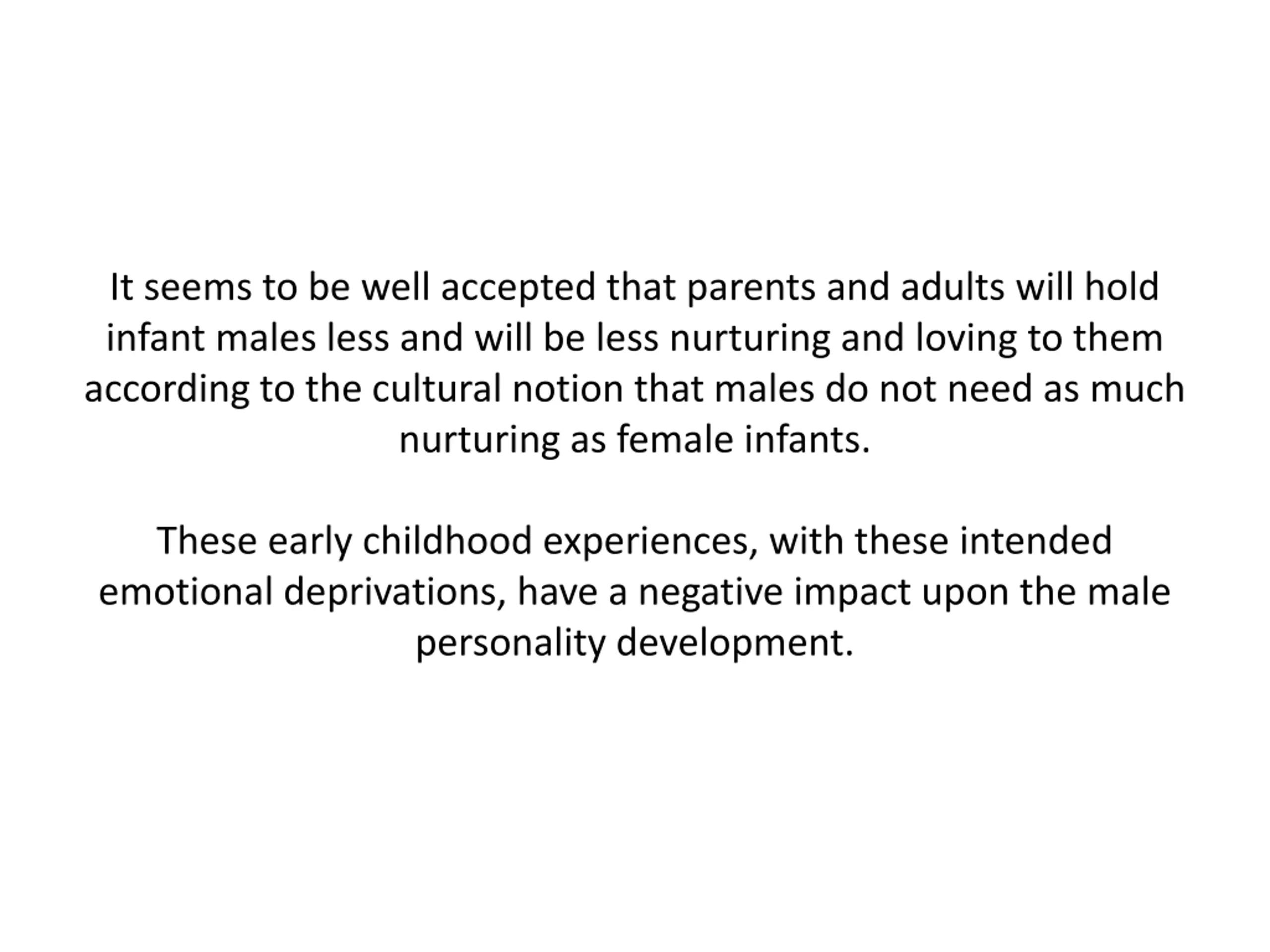 It seems to be well accepted that parents and adults will hold infant males less and will be less nurturing and loving to them according to the cultural notion that males do not need as much nurturing as female infants. These early childhood experiences, with these intended emotional deprivations, have a negative impact upon the male personality development.