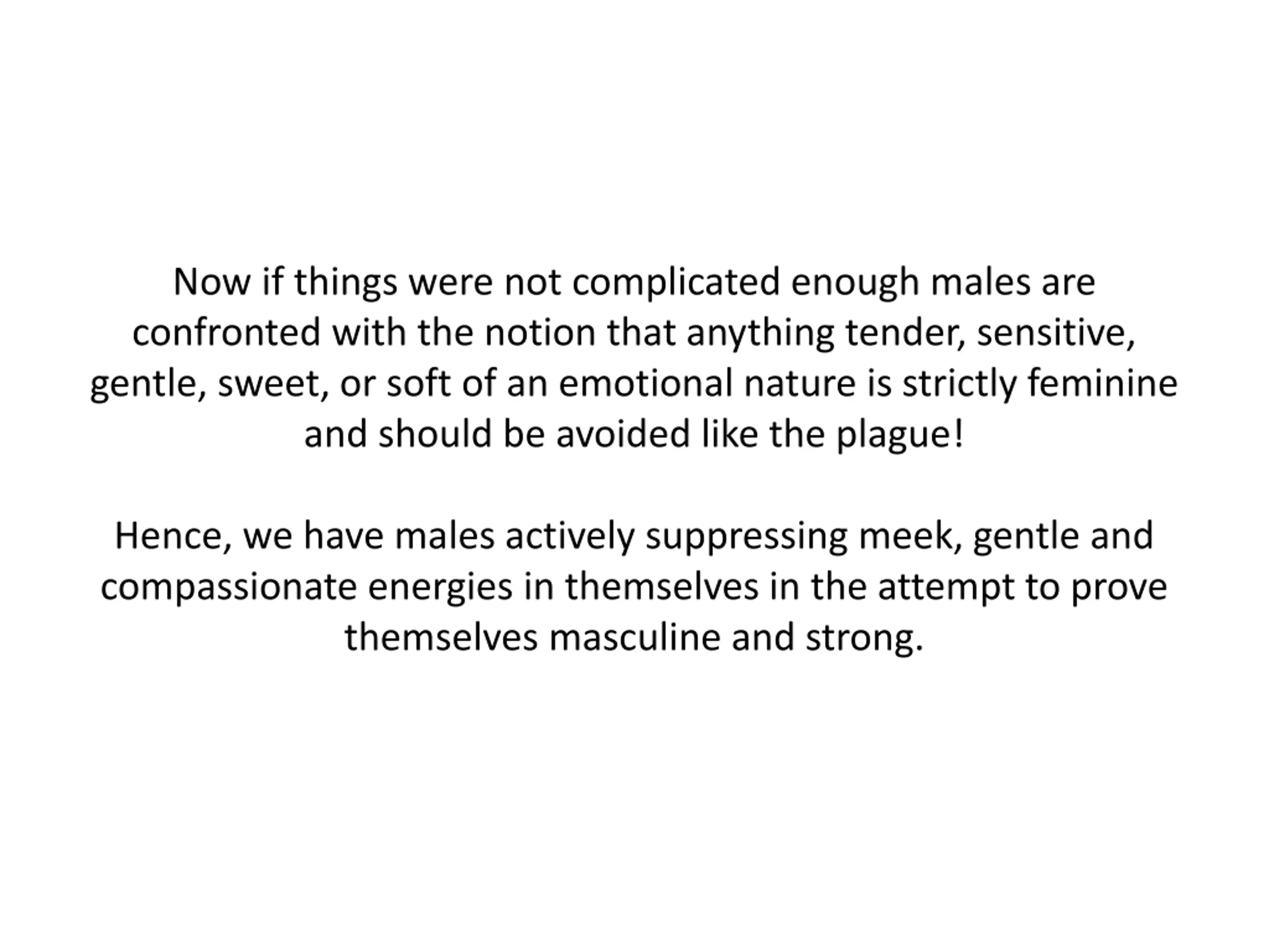 Now if things were not complicated enough males are confronted with the notion that anything tender, sensitive, gentle, sweet, or soft of an emotional nature is strictly feminine and should be avoided like the plague! Hence, we have males actively suppressing meek, gentle and compassionate energies in themselves in the attempt to prove themselves masculine and strong.