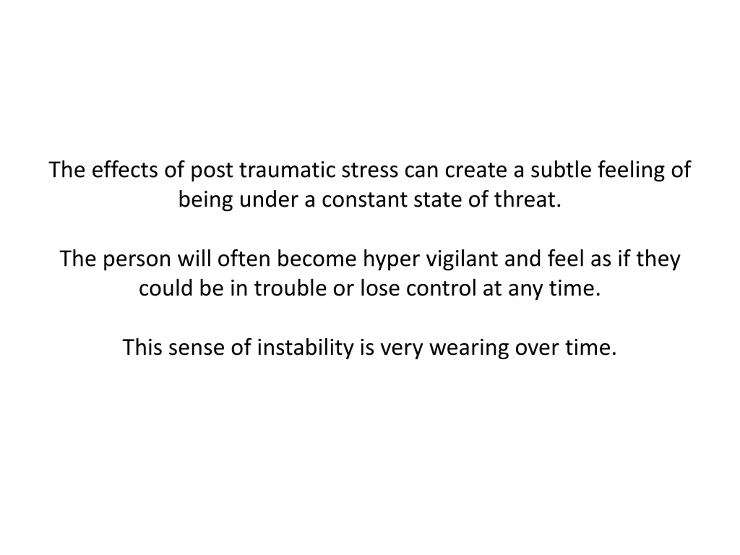 The effects of post traumatic stress can create a subtle feeling of being under a constant state of threat. The person will often become hyper vigilant and feel as if they could be in trouble or lose control at any time. This sense of instability is very wearing over time.