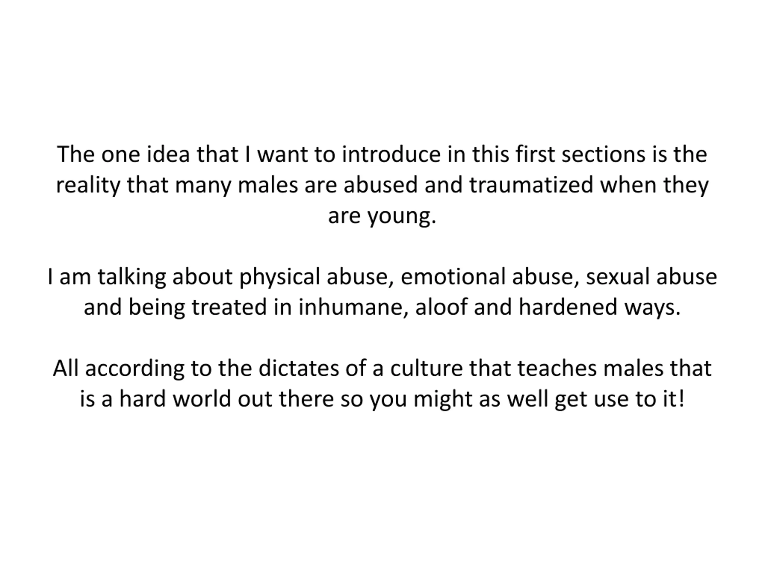 The one idea that I want to introduce in this first sections is the reality that many males are abused and traumatized when they are young. I am talking about physical abuse, emotional abuse, sexual abuse and being treated in inhumane, aloof and hardened ways. All according to the dictates of a culture that teaches males that is a hard world out there so you might as well get use to it!