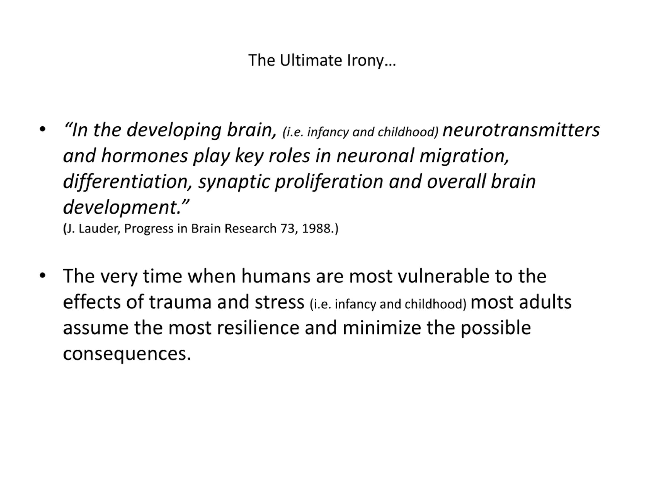 The Ultimate Irony In the developing brain, (i.e. infancy and childhood) neurotransmitters and hormones play key roles in neuronal migration, differentiation, synaptic proliferation and overall brain development. (J. Lauder, Progress in Brain Research 73, 1988.) The very time when humans are most vulnerable to the effects of trauma and stress (i.e. infancy and childhood) most adults assume the most resilience and minimize the possible consequences.