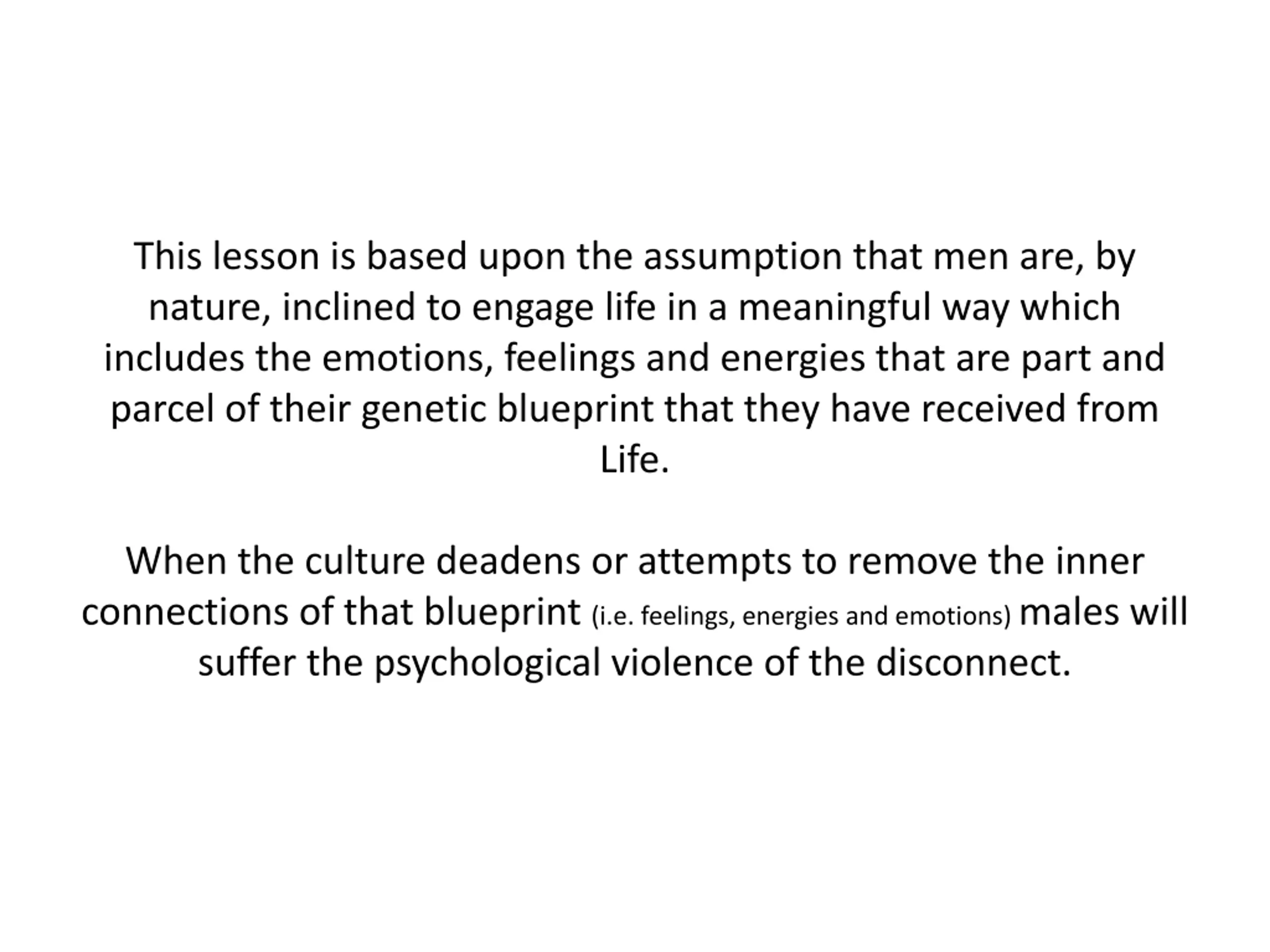 This lesson is based upon the assumption that men are, by nature, inclined to engage life in a meaningful way which includes the emotions, feelings and energies that are part and parcel of their genetic blueprint that they have received from Life. When the culture deadens or attempts to remove the inner connections of that blueprint (i.e. feelings, energies and emotions) males will suffer the psychological violence of the disconnect.