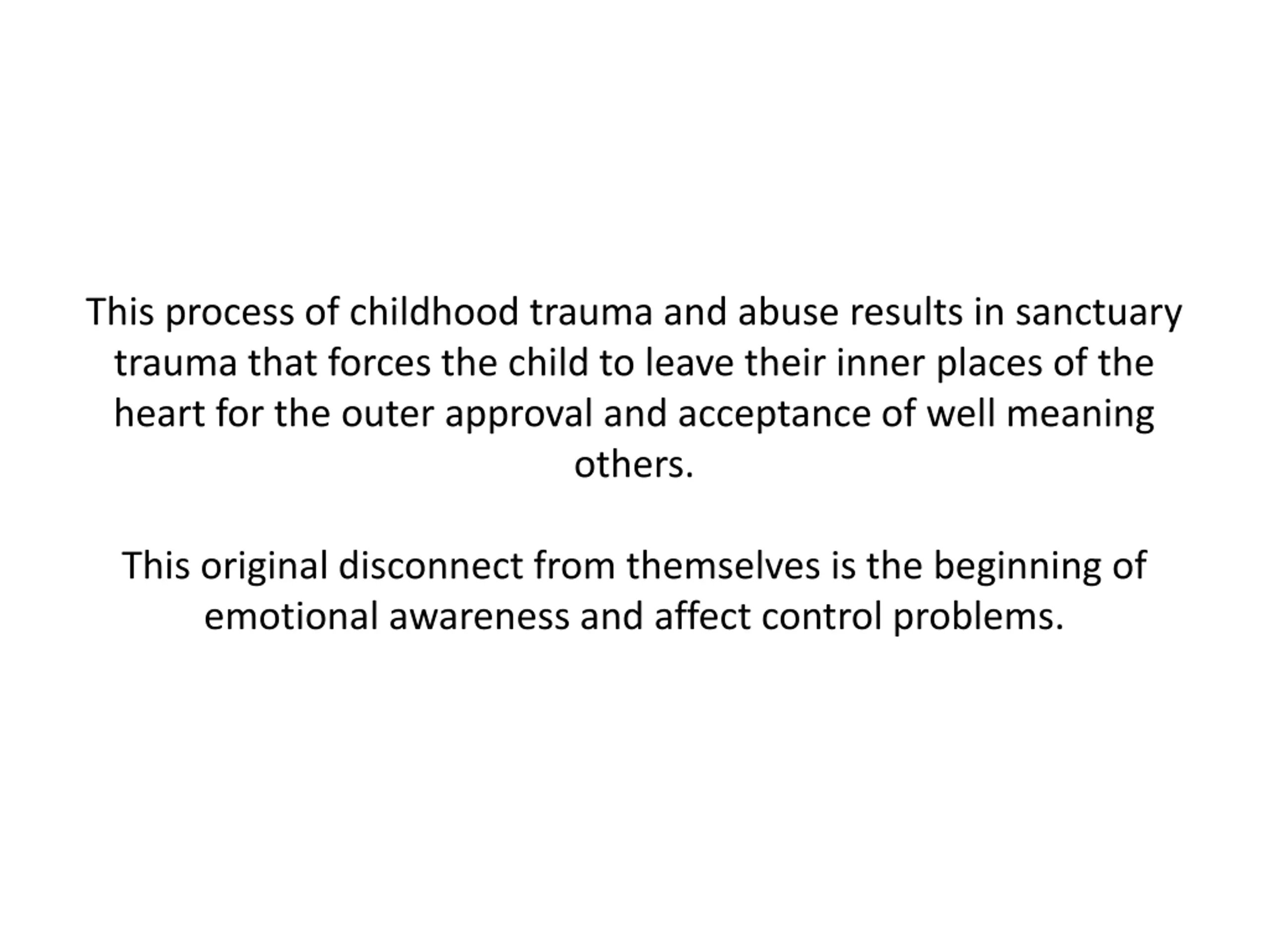 This process of childhood trauma and abuse results in sanctuary trauma that forces the child to leave their inner places of the heart for the outer approval and acceptance of well meaning others. This original disconnect from themselves is the beginning of emotional awareness and affect control problems.