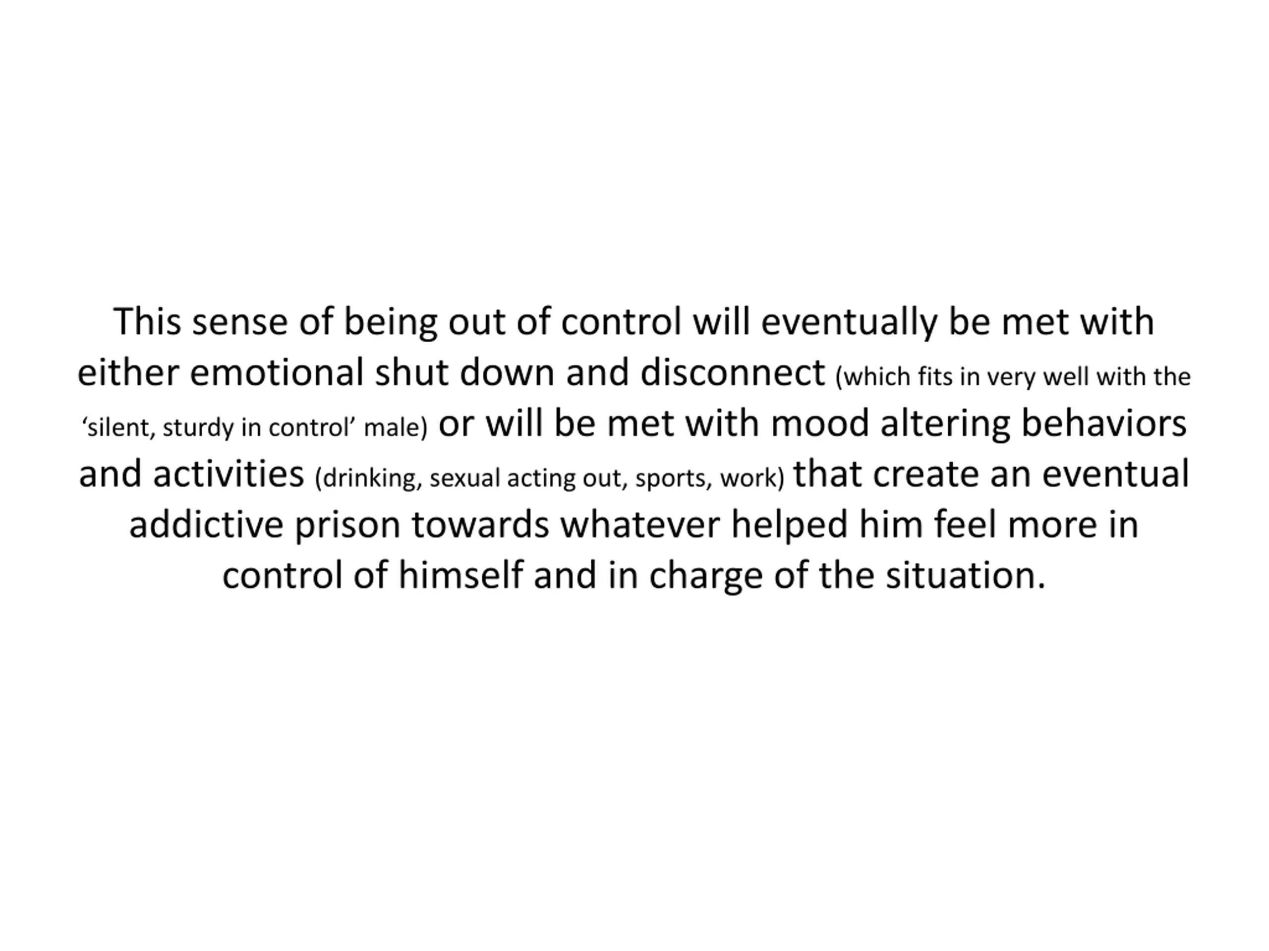 This sense of being out of control will eventually be met with either emotional shut down and disconnect (which fits in very well with the silent, sturdy in control male) or will be met with mood altering behaviors and activities (drinking, sexual acting out, sports, work) that create an eventual addictive prison towards whatever helped him feel more in control of himself and in charge of the situation.