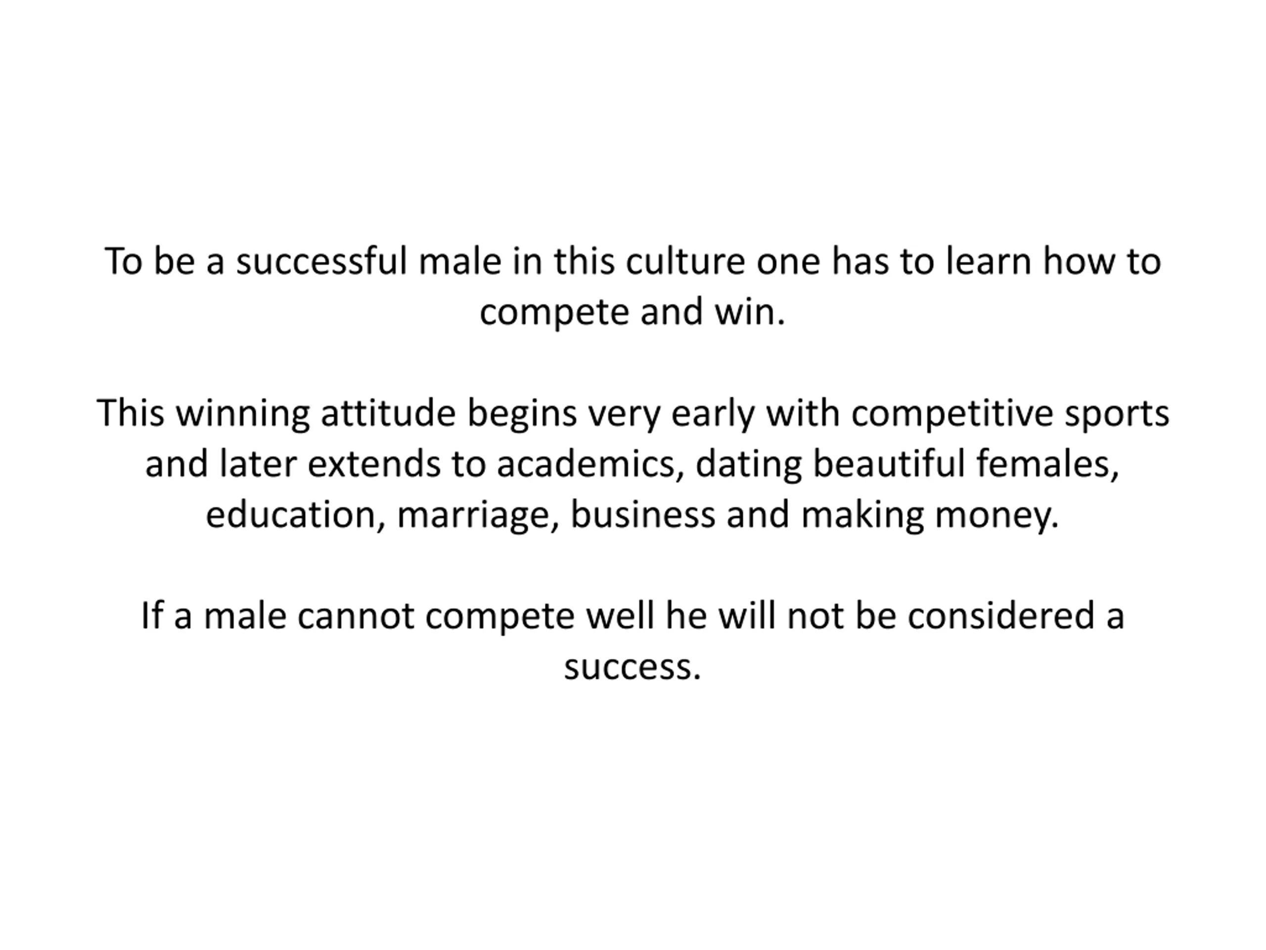 To be a successful male in this culture one has to learn how to compete and win. This winning attitude begins very early with competitive sports and later extends to academics, dating beautiful females, education, marriage, business and making money. If a male cannot compete well he will not be considered a success.