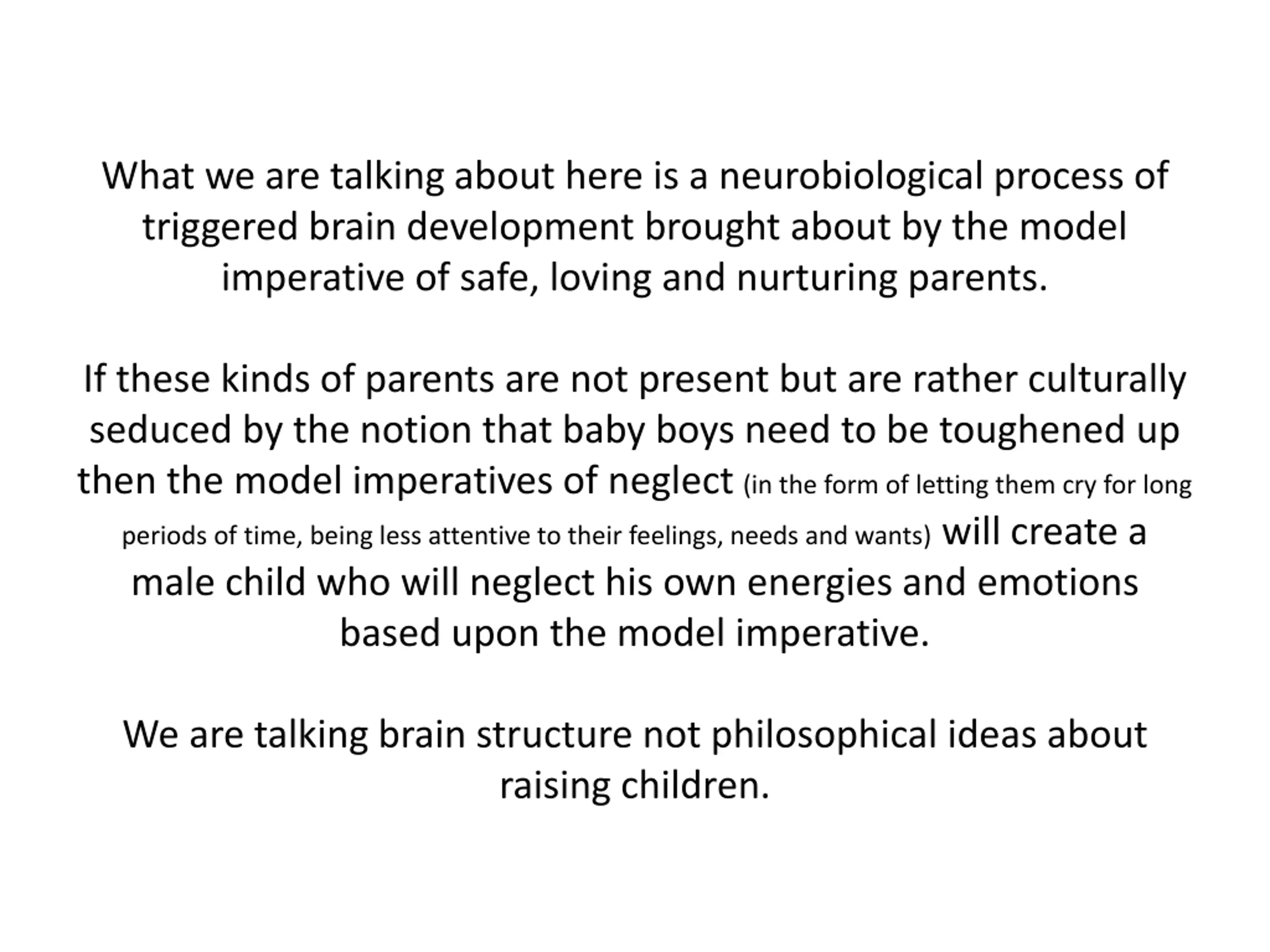 What we are talking about here is a neurobiological process of triggered brain development brought about by the model imperative of safe, loving and nurturing parents. If these kinds of parents are not present but are rather culturally seduced by the notion that baby boys need to be toughened up then the model imperatives of neglect (in the form of letting them cry for long periods of time, being less attentive to their feelings, needs and wants) will create a male child who will neglect his own energies and emotions based upon the model imperative. We are talking brain structure not philosophical ideas about raising children.
