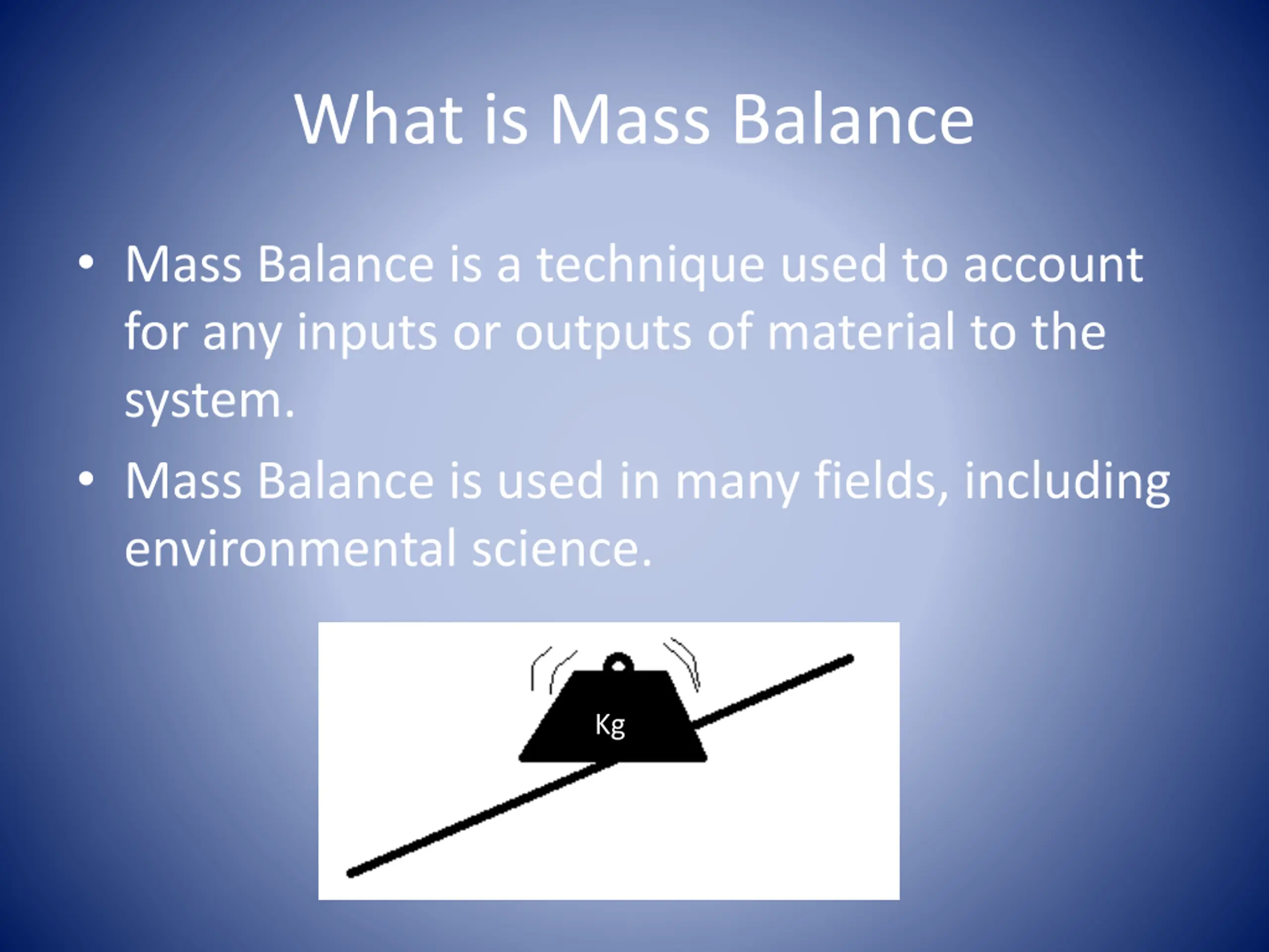 What is Mass Balance Mass Balance is a technique used to account for any inputs or outputs of material to the system. Mass Balance is used in many fields, including environmental science. Kg