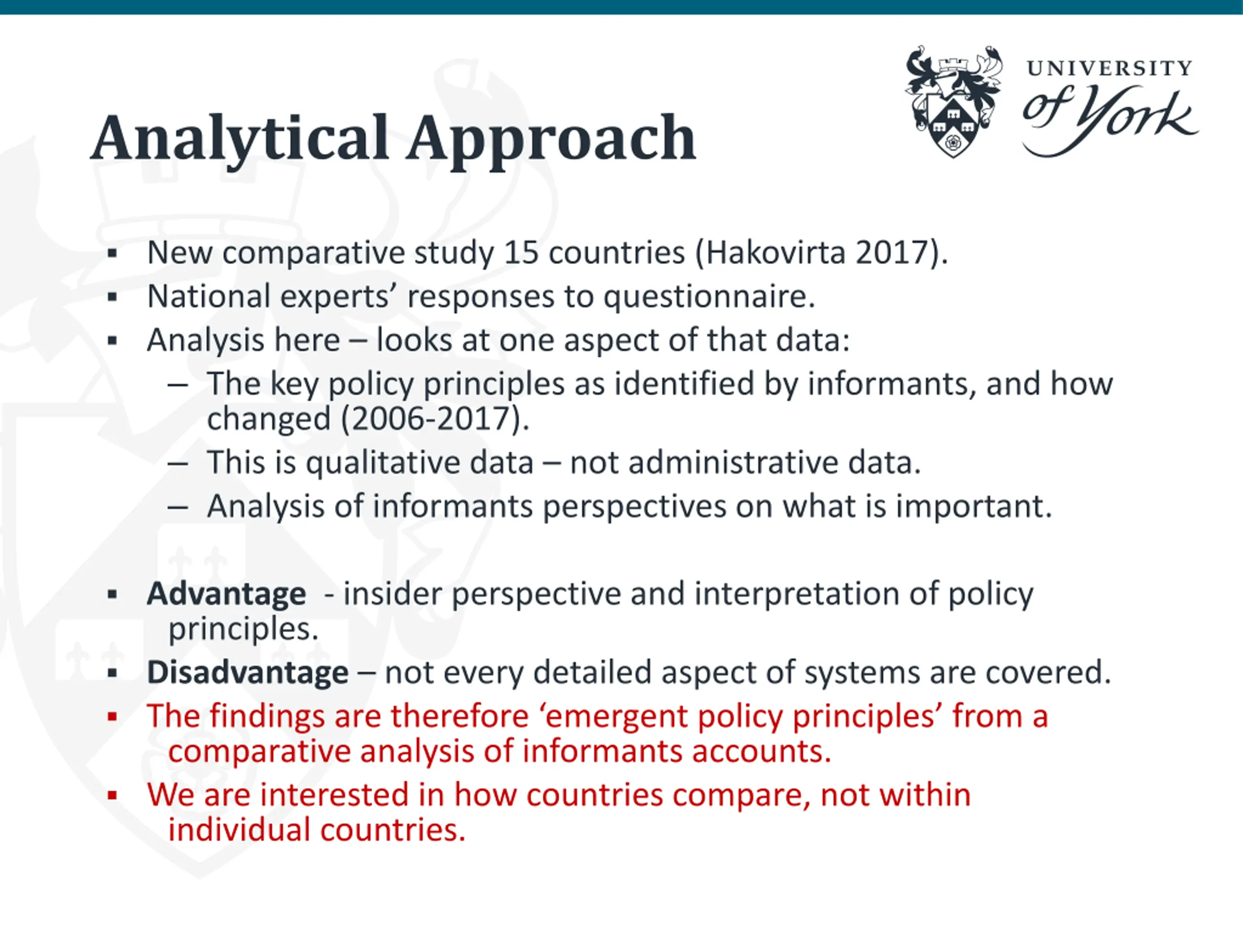 Analytical Approach New comparative study 15 countries (Hakovirta 2017). National experts responses to questionnaire. Analysis here looks at one aspect of that data: The key policy principles as identified by informants, and how changed (2006-2017). This is qualitative data not administrative data. Analysis of informants perspectives on what is important. Advantage - insider perspective and interpretation of policy principles. Disadvantage not every detailed aspect of systems are covered. The findings are therefore emergent policy principles from a comparative analysis of informants accounts. We are interested in how countries compare, not within individual countries.