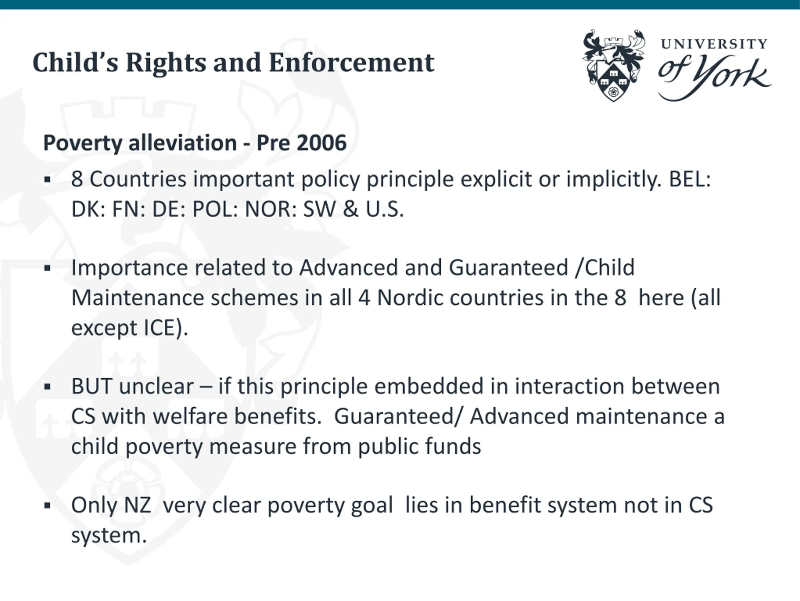 Childs Rights and Enforcement Poverty alleviation - Pre 2006 8 Countries important policy principle explicit or implicitly. BEL: DK: FN: DE: POL: NOR: SW & U.S. Importance related to Advanced and Guaranteed /Child Maintenance schemes in all 4 Nordic countries in the 8 here (all except ICE). BUT unclear if this principle embedded in interaction between CS with welfare benefits. Guaranteed/ Advanced maintenance a child poverty measure from public funds Only NZ very clear poverty goal lies in benefit system not in CS system.