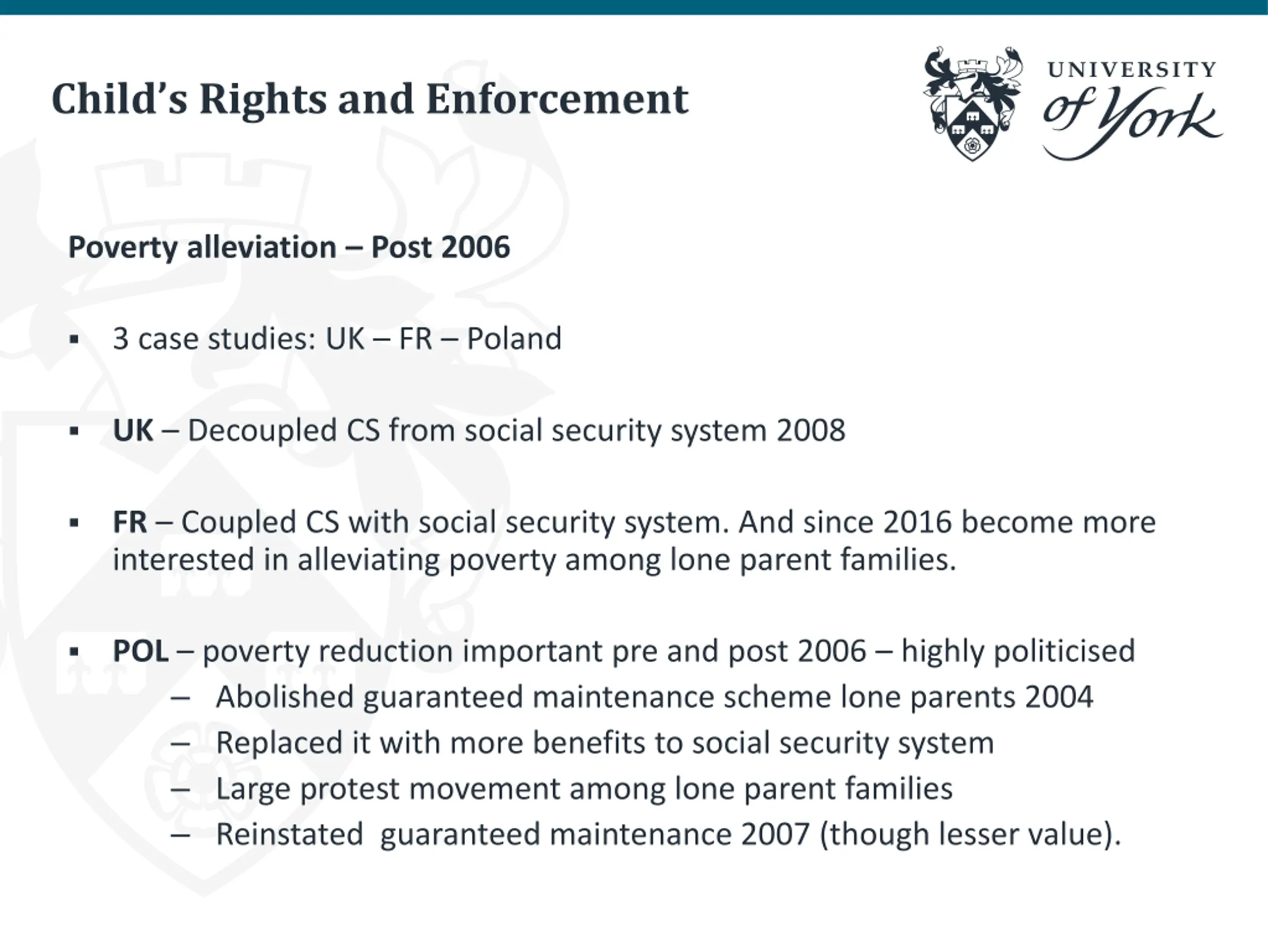 Childs Rights and Enforcement Poverty alleviation Post 2006 3 case studies: UK FR Poland UK Decoupled CS from social security system 2008 FR Coupled CS with social security system. And since 2016 become more interested in alleviating poverty among lone parent families. POL poverty reduction important pre and post 2006 highly politicised Abolished guaranteed maintenance scheme lone parents 2004 Replaced it with more benefits to social security system Large protest movement among lone parent families Reinstated guaranteed maintenance 2007 (though lesser value).