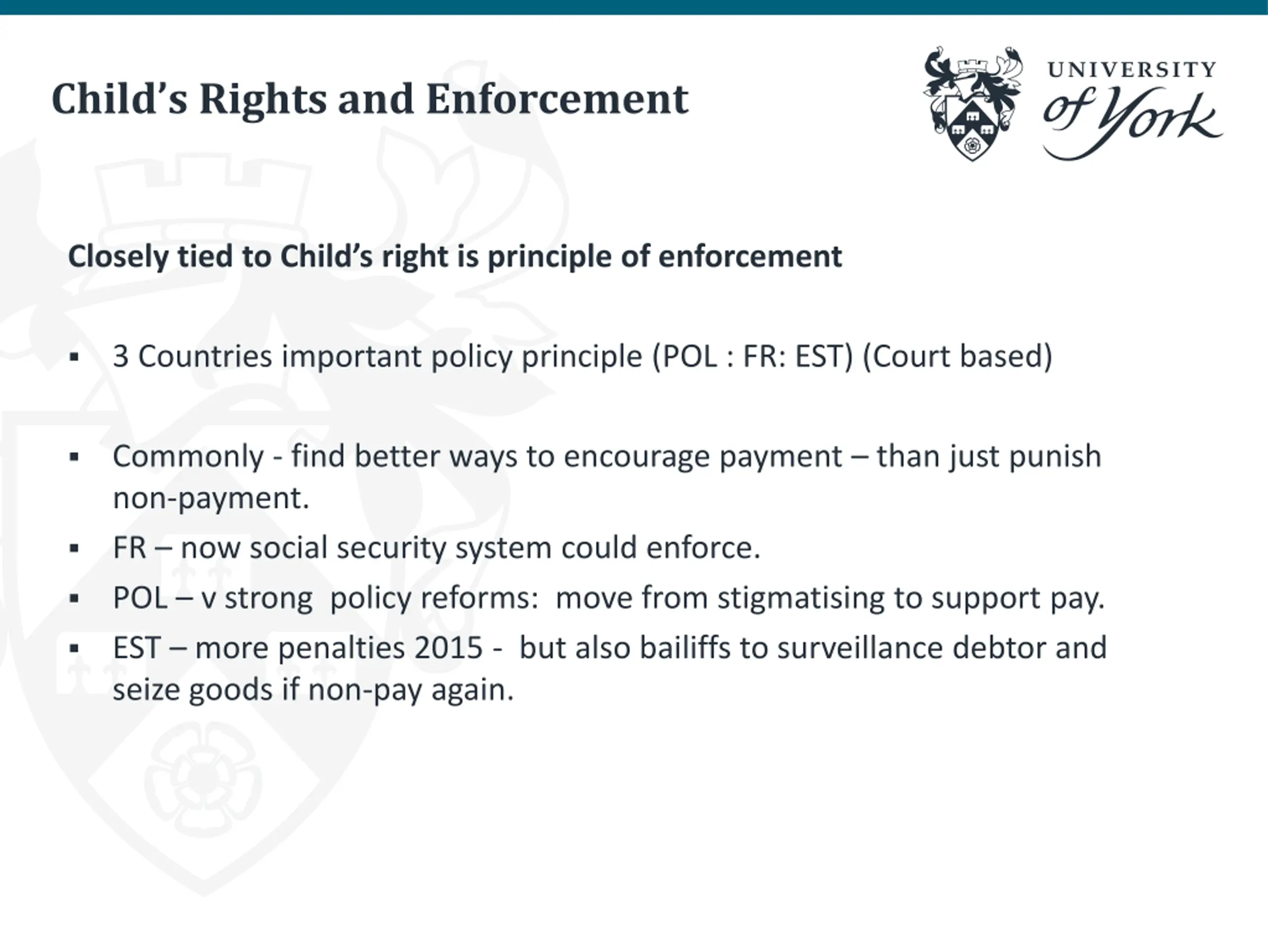 Childs Rights and Enforcement Closely tied to Child s right is principle of enforcement 3 Countries important policy principle (POL : FR: EST) (Court based) Commonly - find better ways to encourage payment than just punish non-payment. FR now social security system could enforce. POL v strong policy reforms: move from stigmatising to support pay. EST more penalties 2015 - but also bailiffs to surveillance debtor and seize goods if non-pay again.
