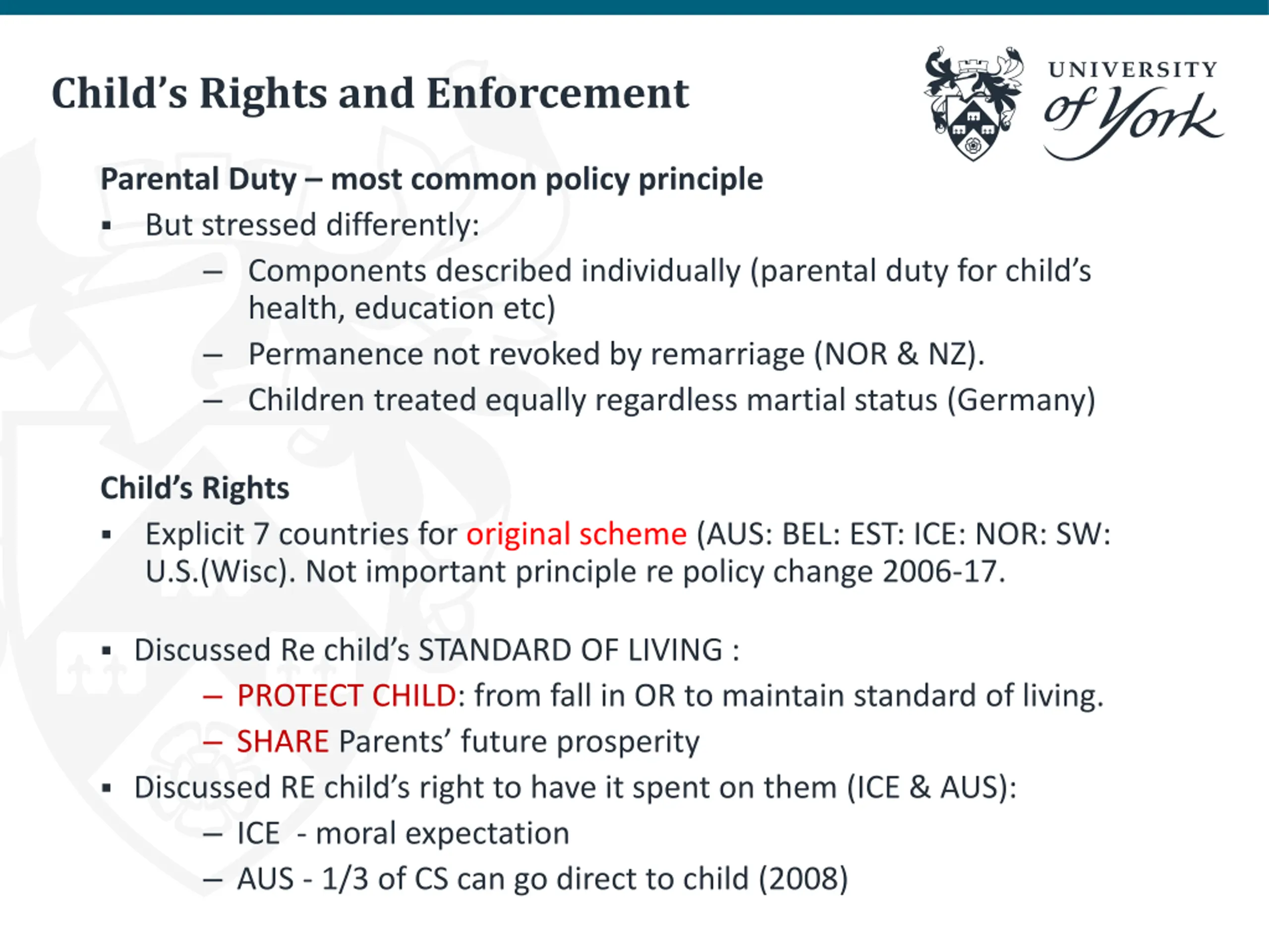 Childs Rights and Enforcement Parental Duty most common policy principle But stressed differently: Components described individually (parental duty for child s health, education etc) Permanence not revoked by remarriage (NOR & NZ). Children treated equally regardless martial status (Germany) Child s Rights Explicit 7 countries for original scheme (AUS: BEL: EST: ICE: NOR: SW: U.S.(Wisc). Not important principle re policy change 2006-17. Discussed Re child s STANDARD OF LIVING : PROTECT CHILD: from fall in OR to maintain standard of living. SHARE Parents future prosperity Discussed RE child s right to have it spent on them (ICE & AUS): ICE - moral expectation AUS - 1/3 of CS can go direct to child (2008)