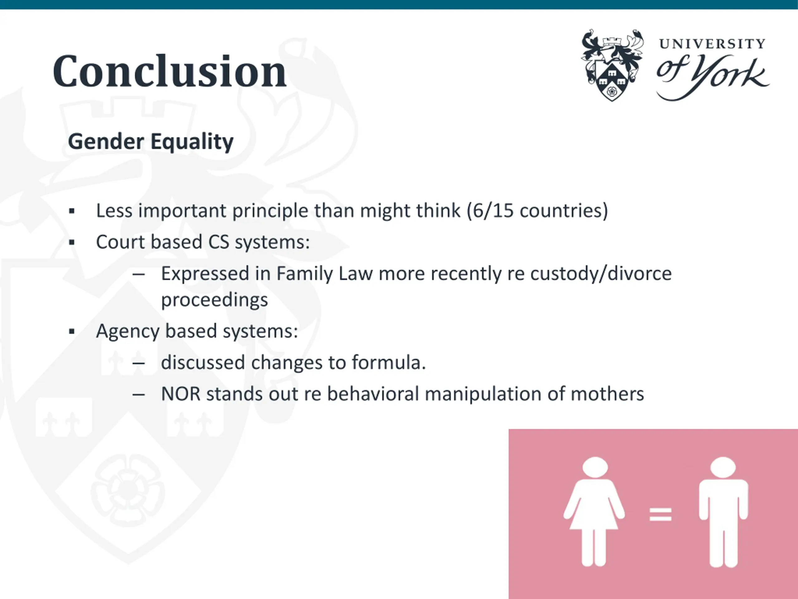 Conclusion Gender Equality Less important principle than might think (6/15 countries) Court based CS systems: Expressed in Family Law more recently re custody/divorce proceedings Agency based systems: discussed changes to formula. NOR stands out re behavioral manipulation of mothers