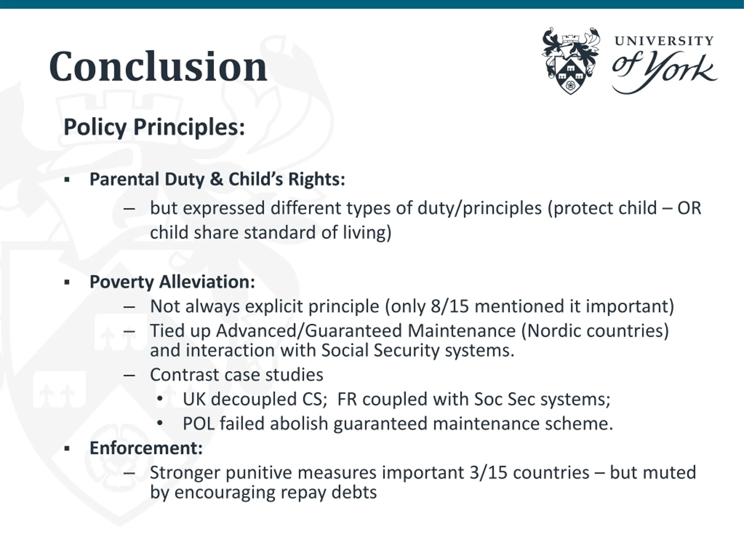 Conclusion Policy Principles: Parental Duty & Child s Rights: but expressed different types of duty/principles (protect child OR child share standard of living) Poverty Alleviation: Not always explicit principle (only 8/15 mentioned it important) Tied up Advanced/Guaranteed Maintenance (Nordic countries) and interaction with Social Security systems. Contrast case studies UK decoupled CS; FR coupled with Soc Sec systems; POL failed abolish guaranteed maintenance scheme. Enforcement: Stronger punitive measures important 3/15 countries but muted by encouraging repay debts
