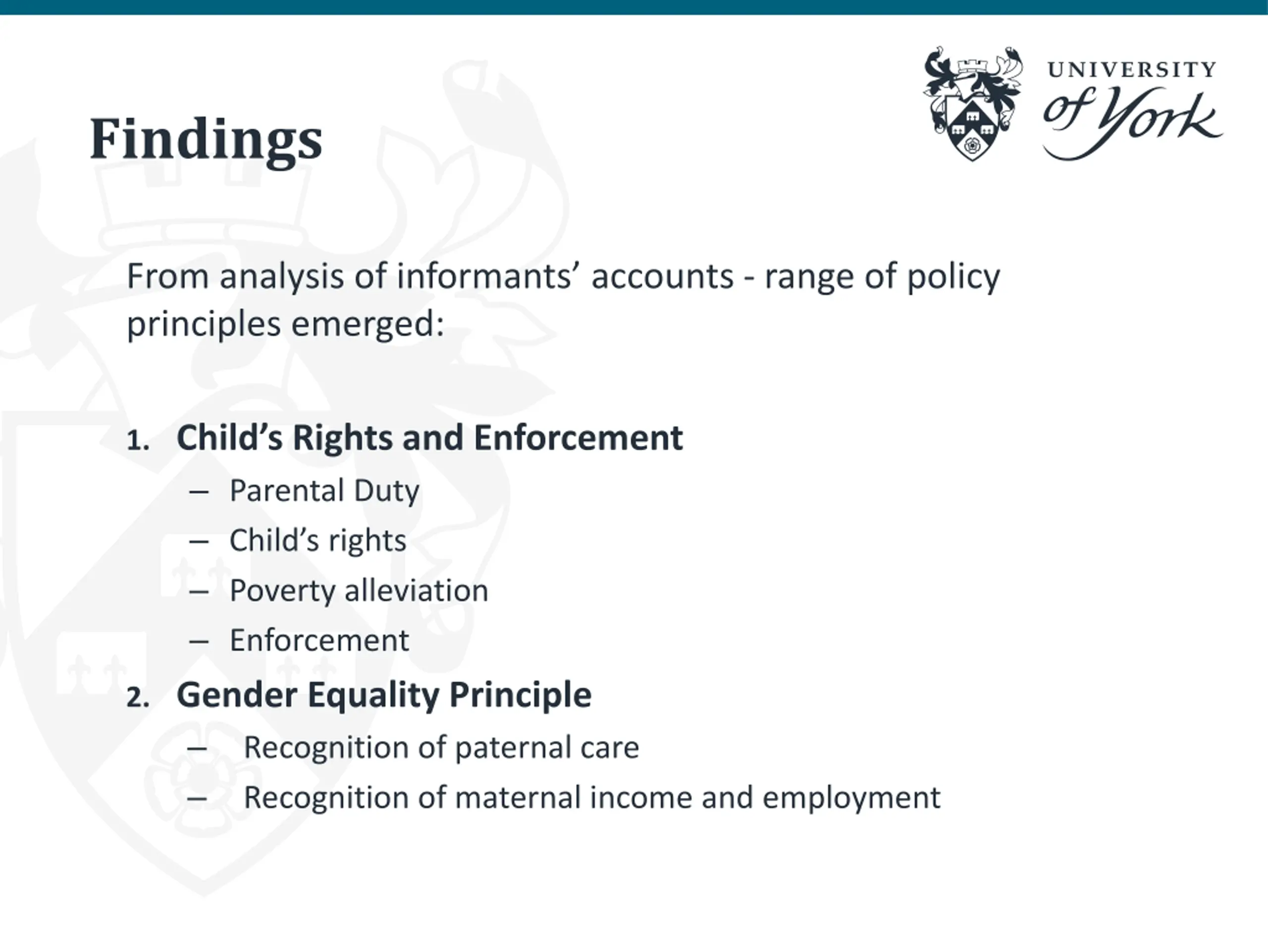 Findings From analysis of informants accounts - range of policy principles emerged: 1. Child s Rights and Enforcement Parental Duty Child s rights Poverty alleviation Enforcement 2. Gender Equality Principle Recognition of paternal care Recognition of maternal income and employment