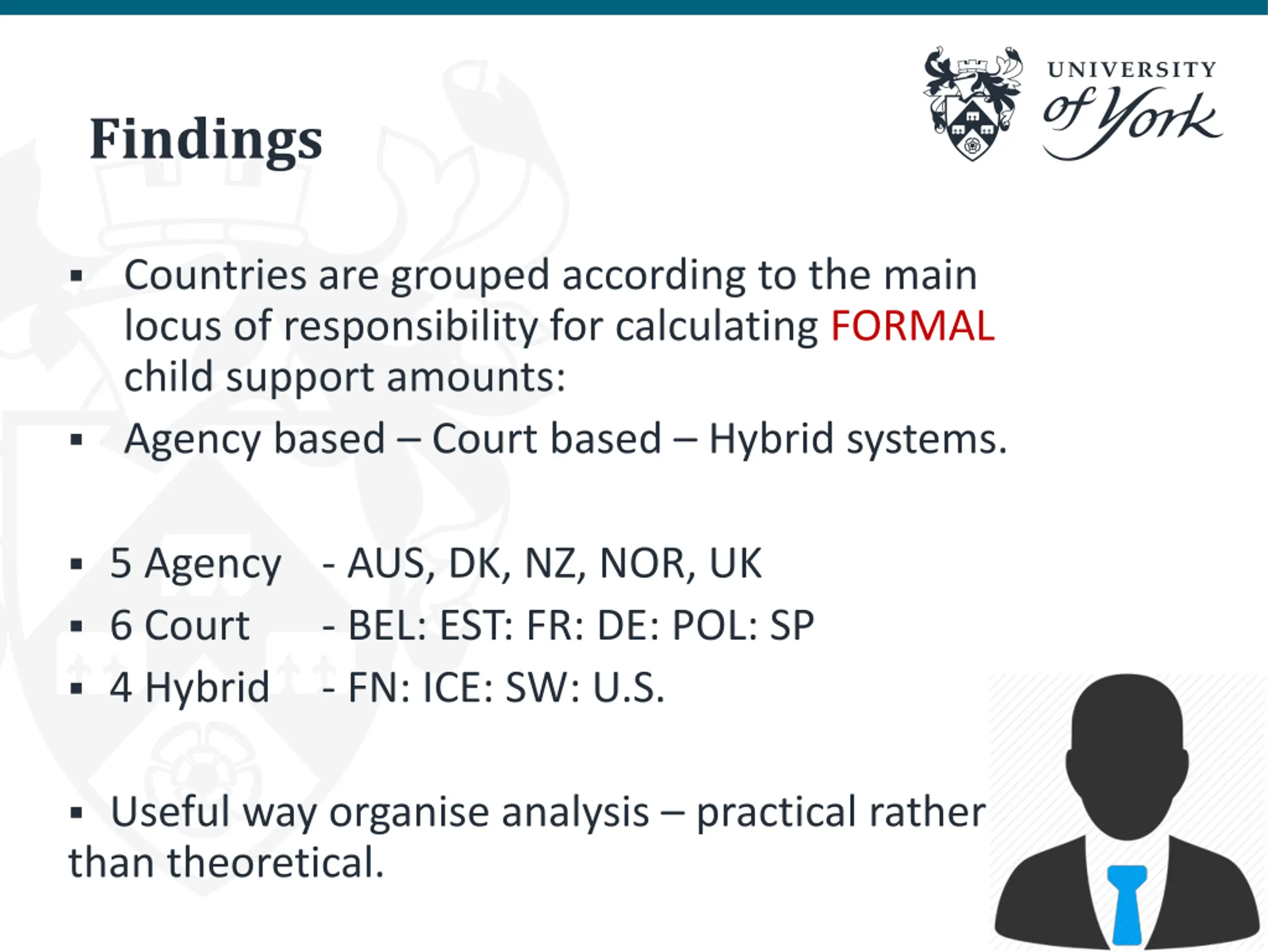 Findings Countries are grouped according to the main locus of responsibility for calculating FORMAL child support amounts: Agency based Court based Hybrid systems. 5 Agency - AUS, DK, NZ, NOR, UK 6 Court - BEL: EST: FR: DE: POL: SP 4 Hybrid - FN: ICE: SW: U.S. Useful way organise analysis practical rather than theoretical.