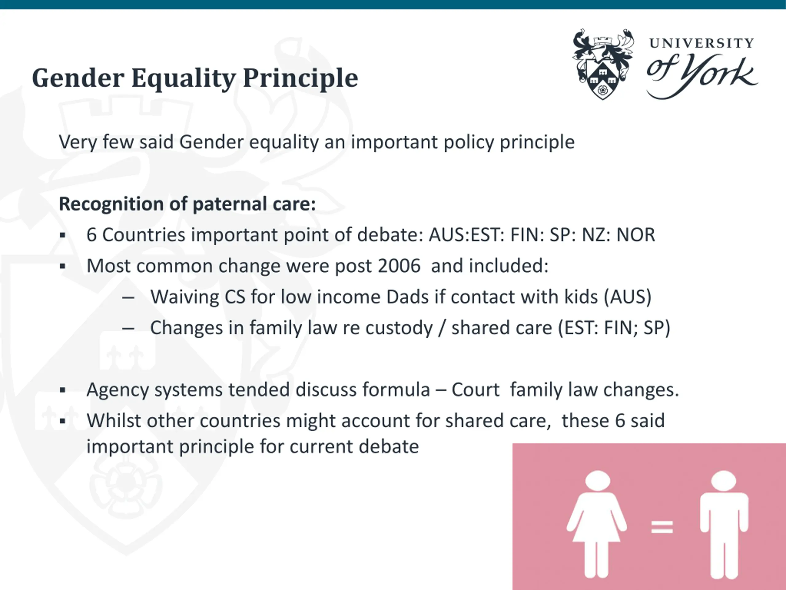 Gender Equality Principle Very few said Gender equality an important policy principle Recognition of paternal care: 6 Countries important point of debate: AUS:EST: FIN: SP: NZ: NOR Most common change were post 2006 and included: Waiving CS for low income Dads if contact with kids (AUS) Changes in family law re custody / shared care (EST: FIN; SP) Agency systems tended discuss formula Court family law changes. Whilst other countries might account for shared care, these 6 said important principle for current debate