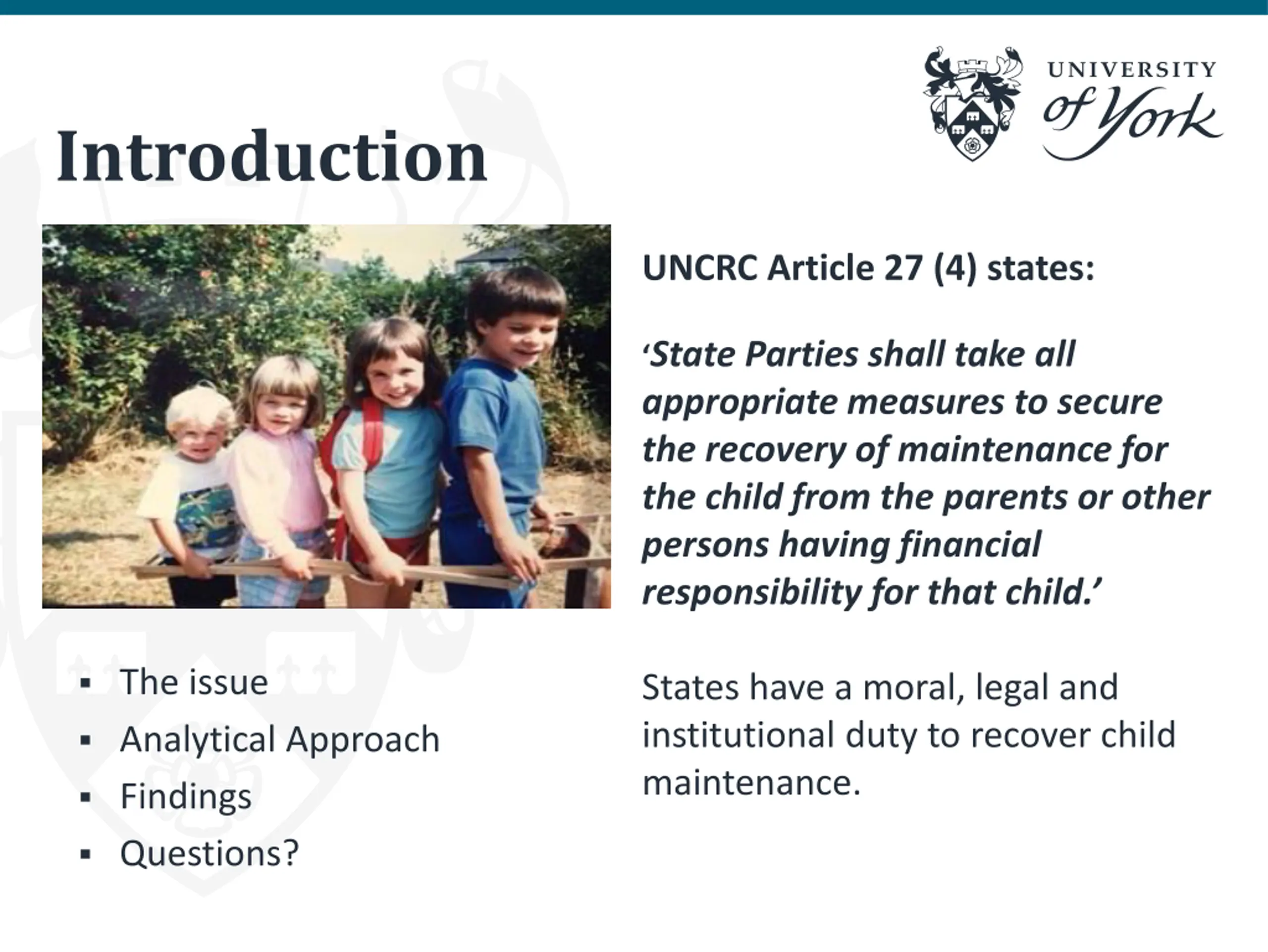 Introduction UNCRC Article 27 (4) states: State Parties shall take all appropriate measures to secure the recovery of maintenance for the child from the parents or other persons having financial responsibility for that child. The issue States have a moral, legal and institutional duty to recover child maintenance. Analytical Approach Findings Questions?