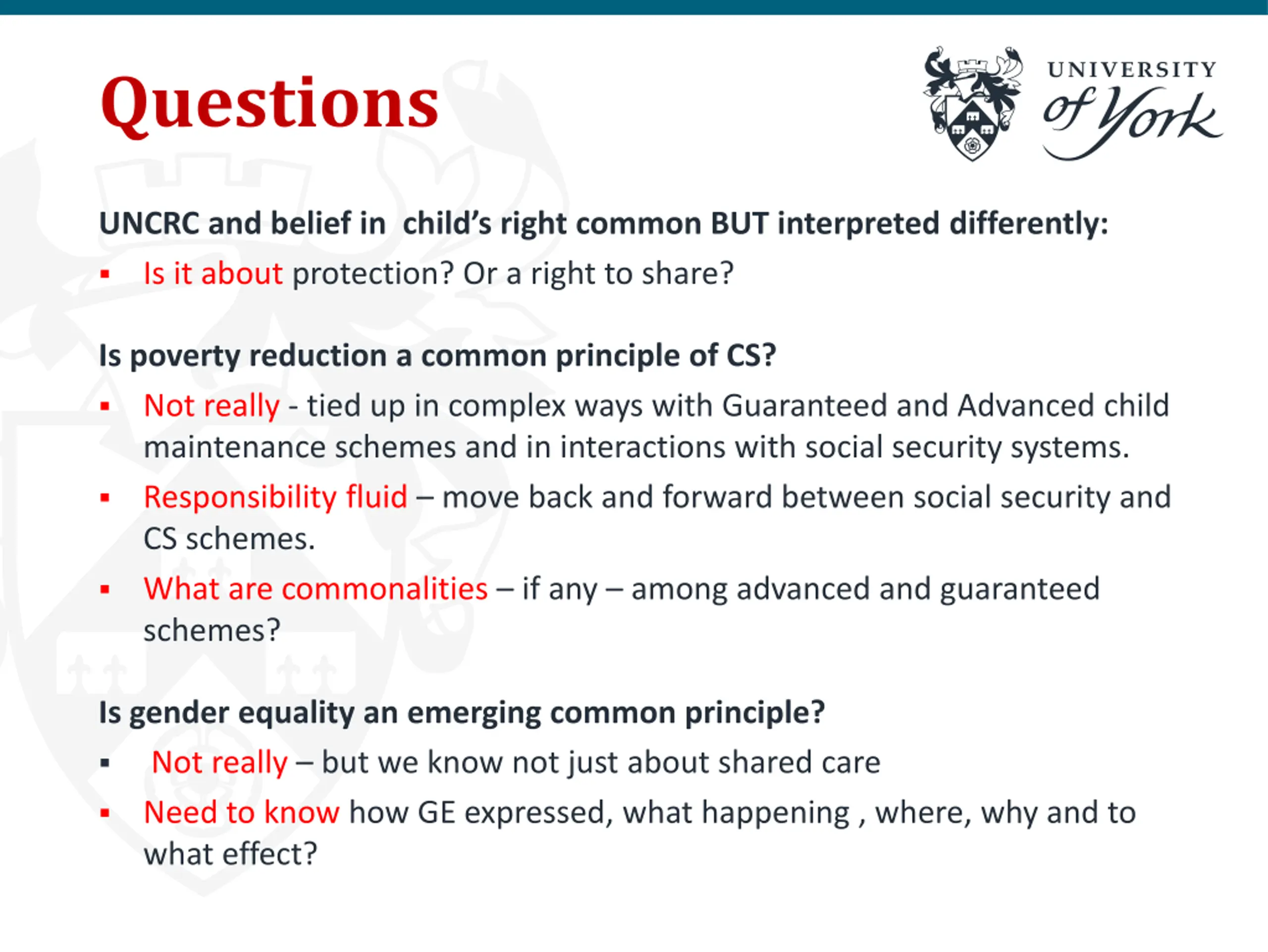 Questions UNCRC and belief in child s right common BUT interpreted differently: Is it about protection? Or a right to share? Is poverty reduction a common principle of CS? Not really - tied up in complex ways with Guaranteed and Advanced child maintenance schemes and in interactions with social security systems. Responsibility fluid move back and forward between social security and CS schemes. What are commonalities if any among advanced and guaranteed schemes? Is gender equality an emerging common principle? Not really but we know not just about shared care Need to know how GE expressed, what happening , where, why and to what effect?