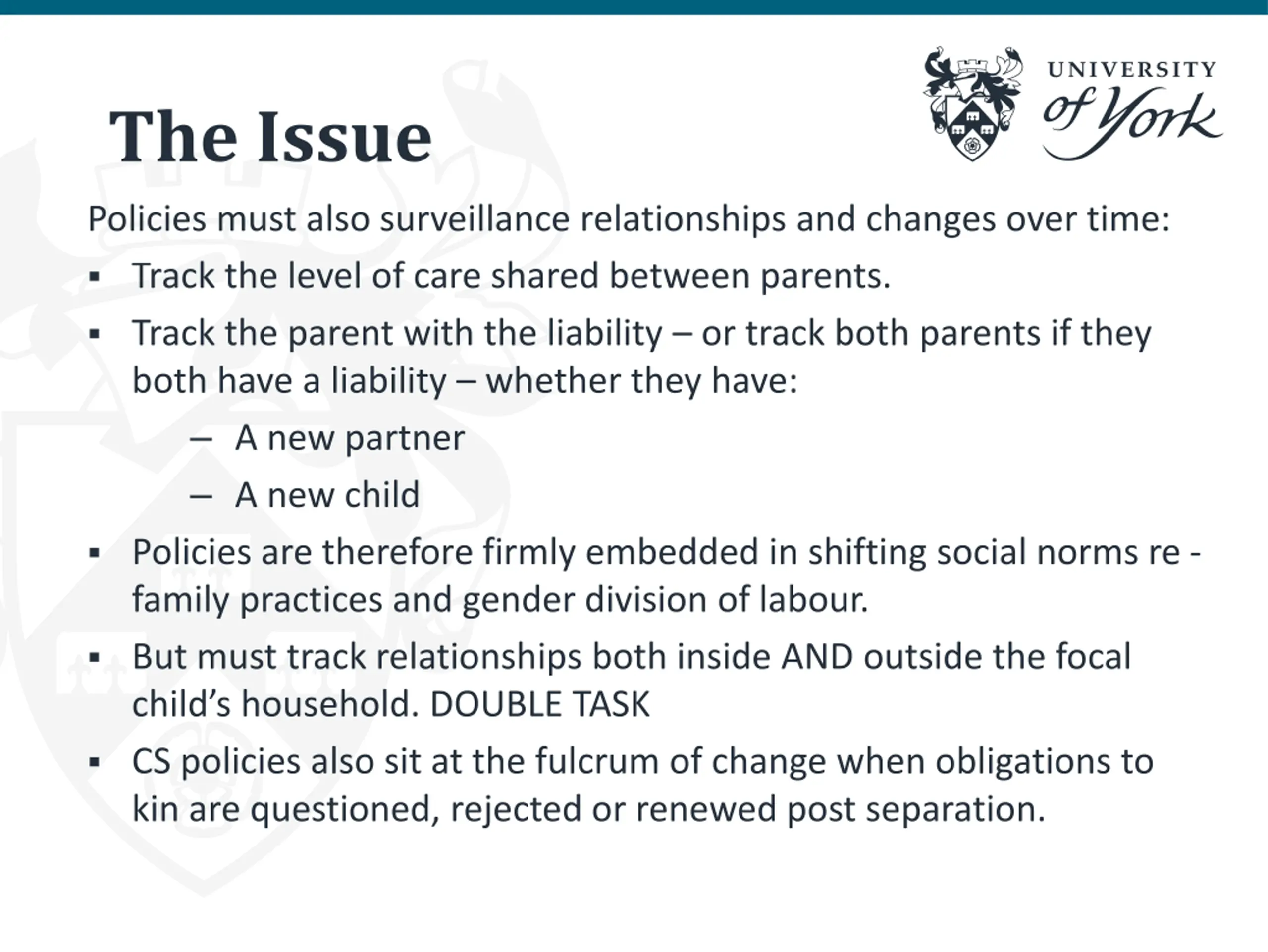 The Issue Policies must also surveillance relationships and changes over time: Track the level of care shared between parents. Track the parent with the liability or track both parents if they both have a liability whether they have: A new partner A new child Policies are therefore firmly embedded in shifting social norms re - family practices and gender division of labour. But must track relationships both inside AND outside the focal child s household. DOUBLE TASK CS policies also sit at the fulcrum of change when obligations to kin are questioned, rejected or renewed post separation.
