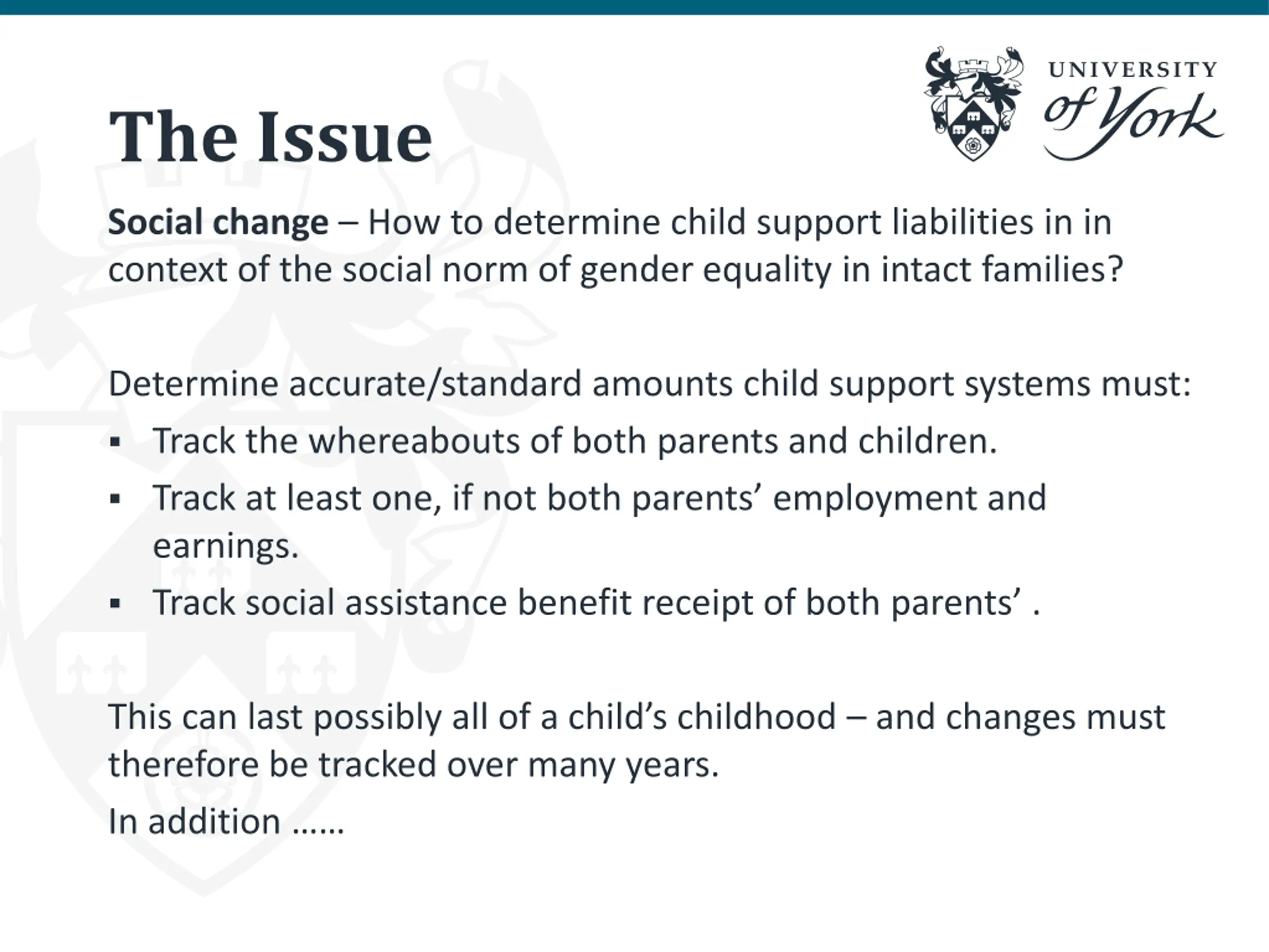 The Issue Social change How to determine child support liabilities in in context of the social norm of gender equality in intact families? Determine accurate/standard amounts child support systems must: Track the whereabouts of both parents and children. Track at least one, if not both parents employment and earnings. Track social assistance benefit receipt of both parents . This can last possibly all of a child s childhood and changes must therefore be tracked over many years. In addition