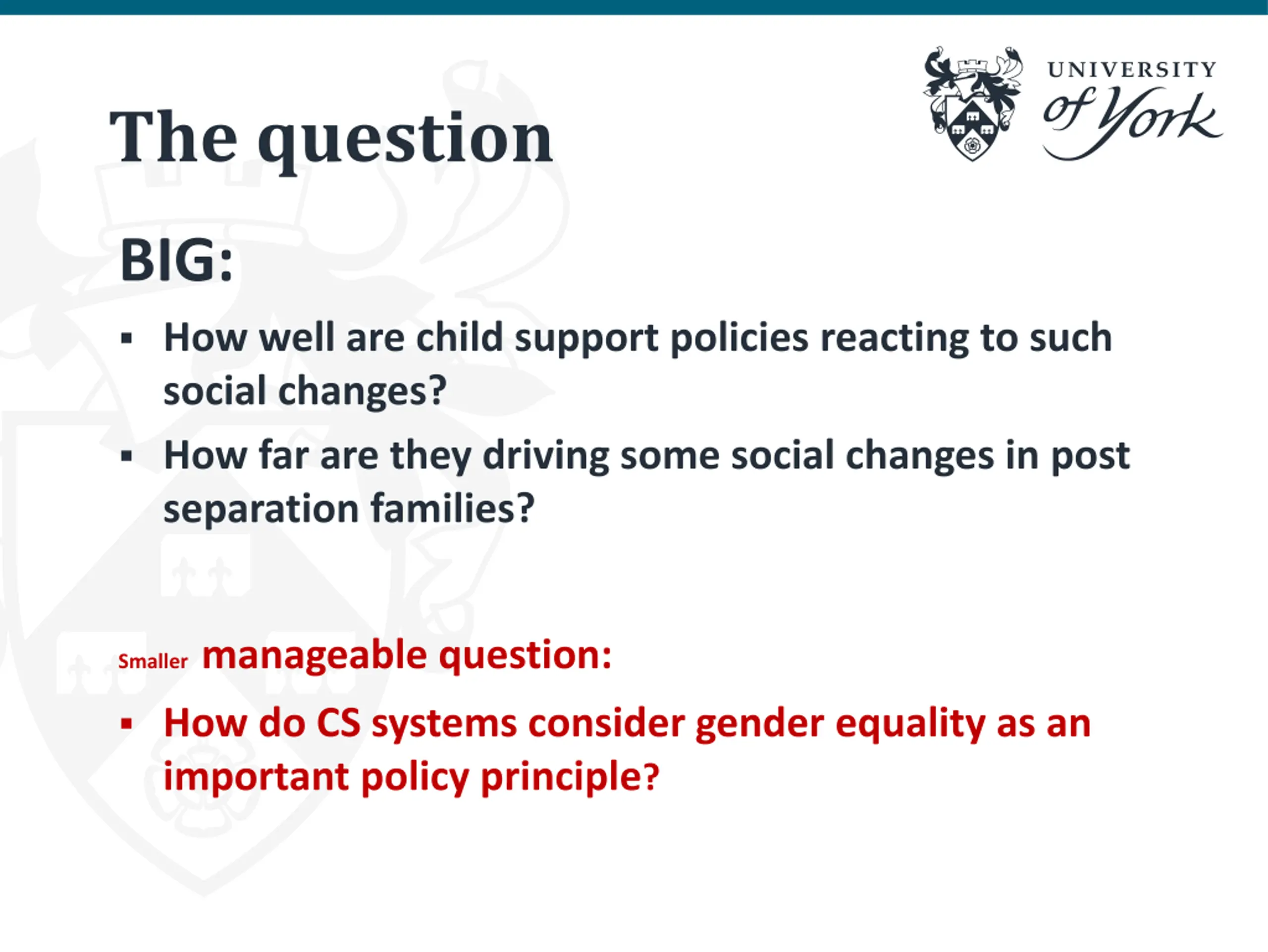The question BIG: How well are child support policies reacting to such social changes? How far are they driving some social changes in post separation families? Smallermanageable question: How do CS systems consider gender equality as an important policy principle?