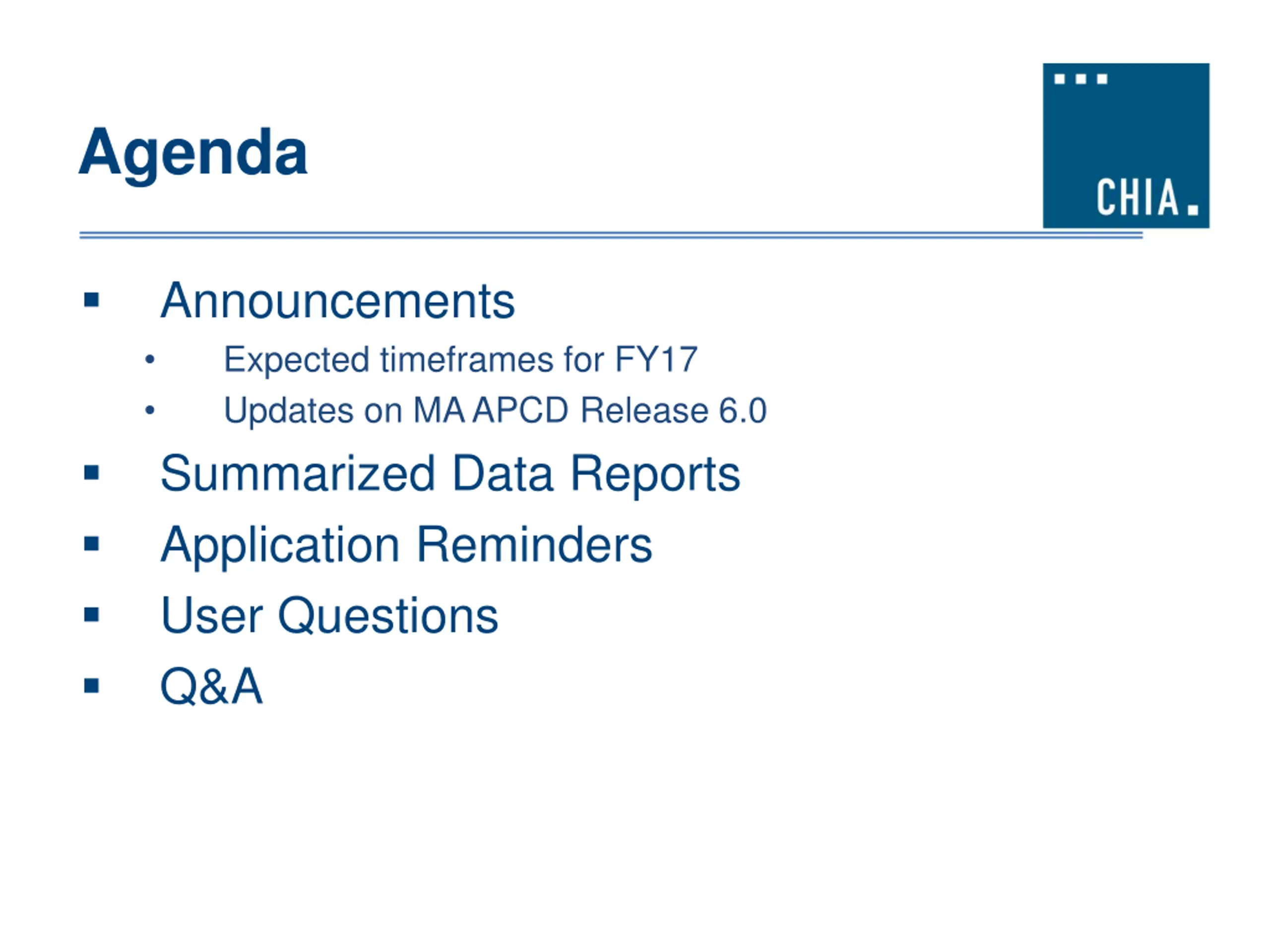 Agenda Announcements Expected timeframes for FY17 Updates on MA APCD Release 6.0 Summarized Data Reports Application Reminders User Questions Q&A