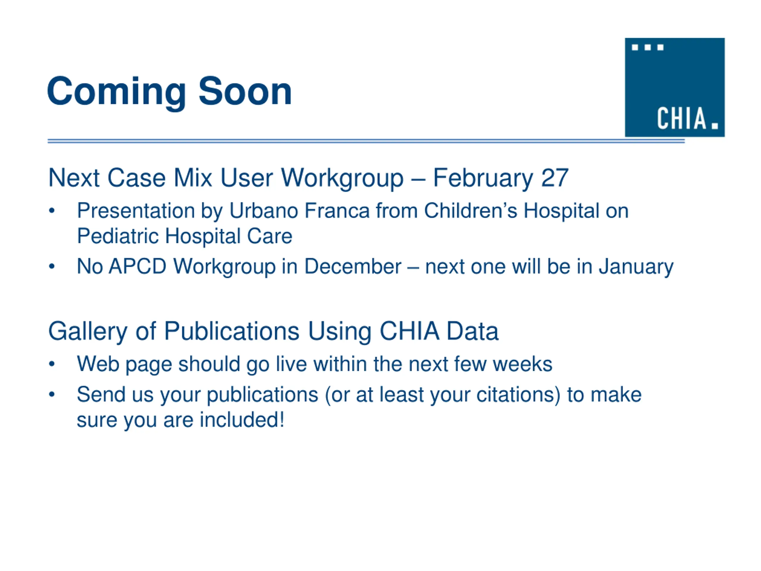 Coming Soon Next Case Mix User Workgroup February 27 Presentation by Urbano Franca from Children s Hospital on Pediatric Hospital Care No APCD Workgroup in December next one will be in January Gallery of Publications Using CHIA Data Web page should go live within the next few weeks Send us your publications (or at least your citations) to make sure you are included!