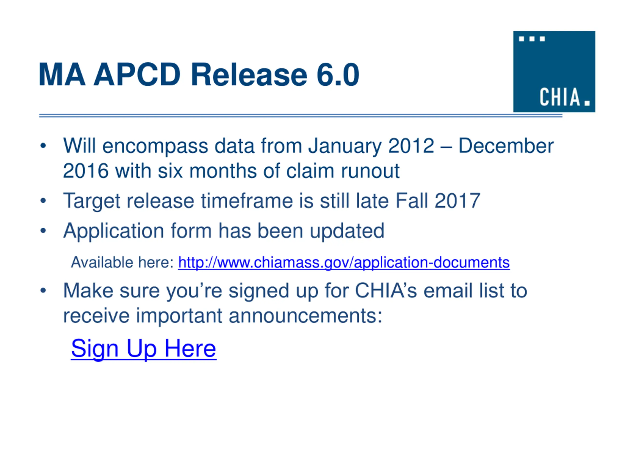 MA APCD Release 6.0 Will encompass data from January 2012 December 2016 with six months of claim runout Target release timeframe is still late Fall 2017 Application form has been updated Available here: http://www.chiamass.gov/application-documents Make sure you re signed up for CHIA s email list to receive important announcements: Sign Up Here