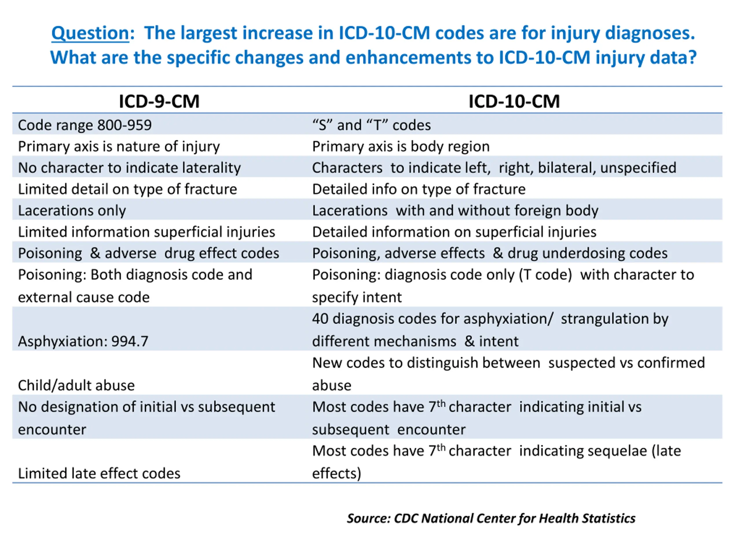 Question: The largest increase in ICD-10-CM codes are for injury diagnoses. What are the specific changes and enhancements to ICD-10-CM injury data? ICD-9-CM ICD-10-CM Code range 800-959 Primary axis is nature of injury No character to indicate laterality Limited detail on type of fracture Lacerations only Limited information superficial injuries Poisoning & adverse drug effect codes Poisoning: Both diagnosis code and external cause code S and T codes Primary axis is body region Characters to indicate left, right, bilateral, unspecified Detailed info on type of fracture Lacerations with and without foreign body Detailed information on superficial injuries Poisoning, adverse effects & drug underdosing codes Poisoning: diagnosis code only (T code) with character to specify intent 40 diagnosis codes for asphyxiation/ strangulation by different mechanisms & intent New codes to distinguish between suspected vs confirmed abuse Most codes have 7th character indicating initial vs subsequent encounter Most codes have 7th character indicating sequelae (late effects) Asphyxiation: 994.7 Child/adult abuse No designation of initial vs subsequent encounter Limited late effect codes Source: CDC National Center for Health Statistics