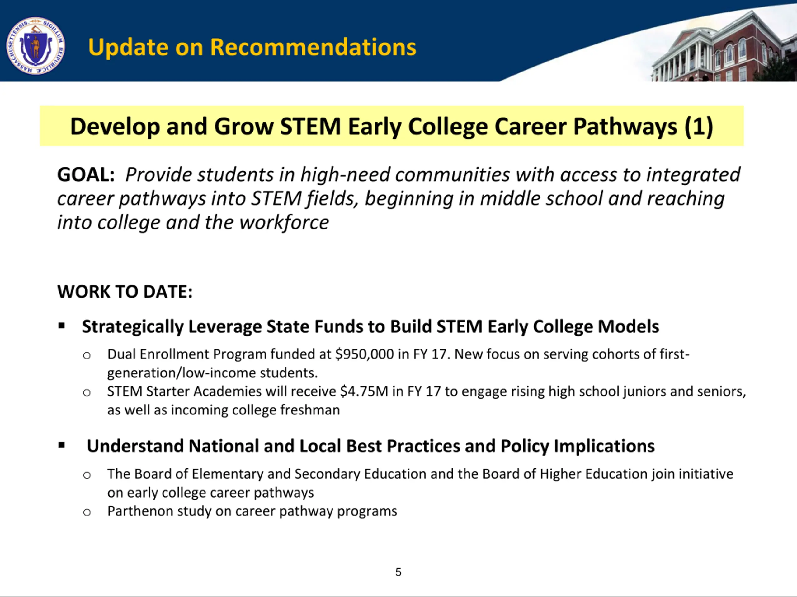 Update on Recommendations Develop and Grow STEM Early College Career Pathways (1) GOAL: Provide students in high-need communities with access to integrated career pathways into STEM fields, beginning in middle school and reaching into college and the workforce WORK TO DATE: Strategically Leverage State Funds to Build STEM Early College Models o Dual Enrollment Program funded at $950,000 in FY 17. New focus on serving cohorts of first- generation/low-income students. STEM Starter Academies will receive $4.75M in FY 17 to engage rising high school juniors and seniors, as well as incoming college freshman o Understand National and Local Best Practices and Policy Implications o The Board of Elementary and Secondary Education and the Board of Higher Education join initiative on early college career pathways Parthenon study on career pathway programs o 5