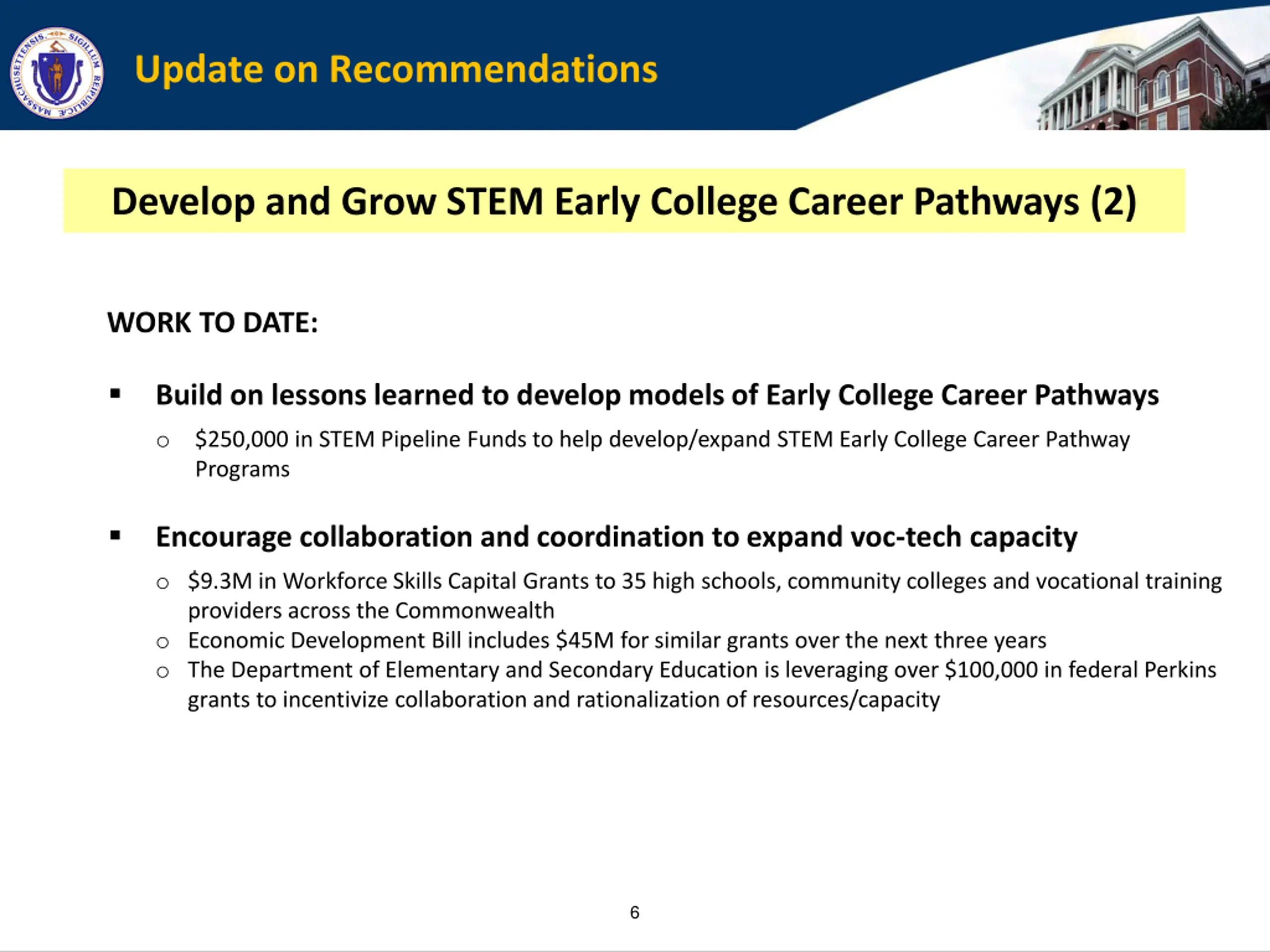 Update on Recommendations Develop and Grow STEM Early College Career Pathways (2) WORK TO DATE: Build on lessons learned to develop models of Early College Career Pathways o $250,000 in STEM Pipeline Funds to help develop/expand STEM Early College Career Pathway Programs Encourage collaboration and coordination to expand voc-tech capacity o $9.3M in Workforce Skills Capital Grants to 35 high schools, community colleges and vocational training providers across the Commonwealth o Economic Development Bill includes $45M for similar grants over the next three years o The Department of Elementary and Secondary Education is leveraging over $100,000 in federal Perkins grants to incentivize collaboration and rationalization of resources/capacity 6