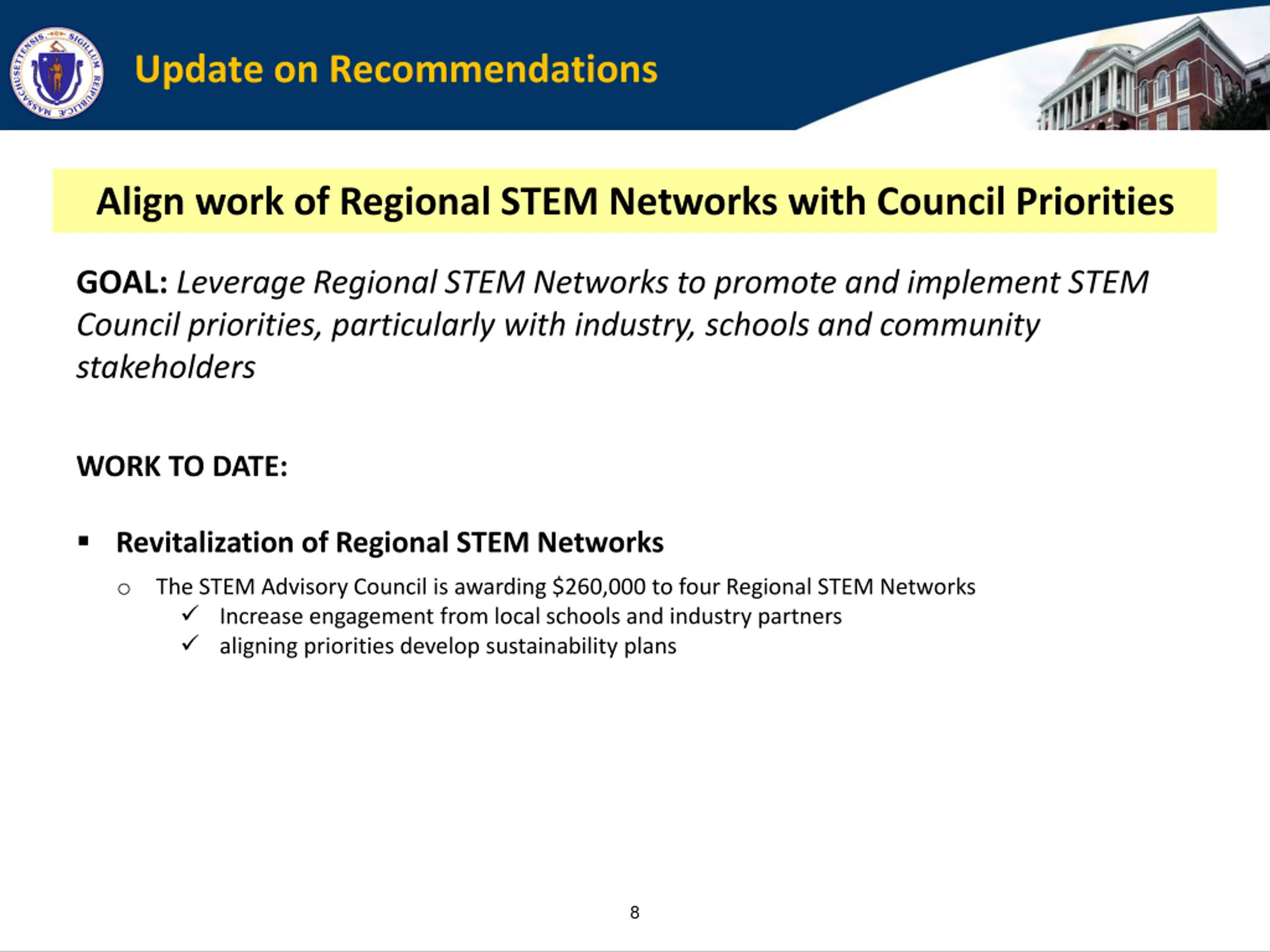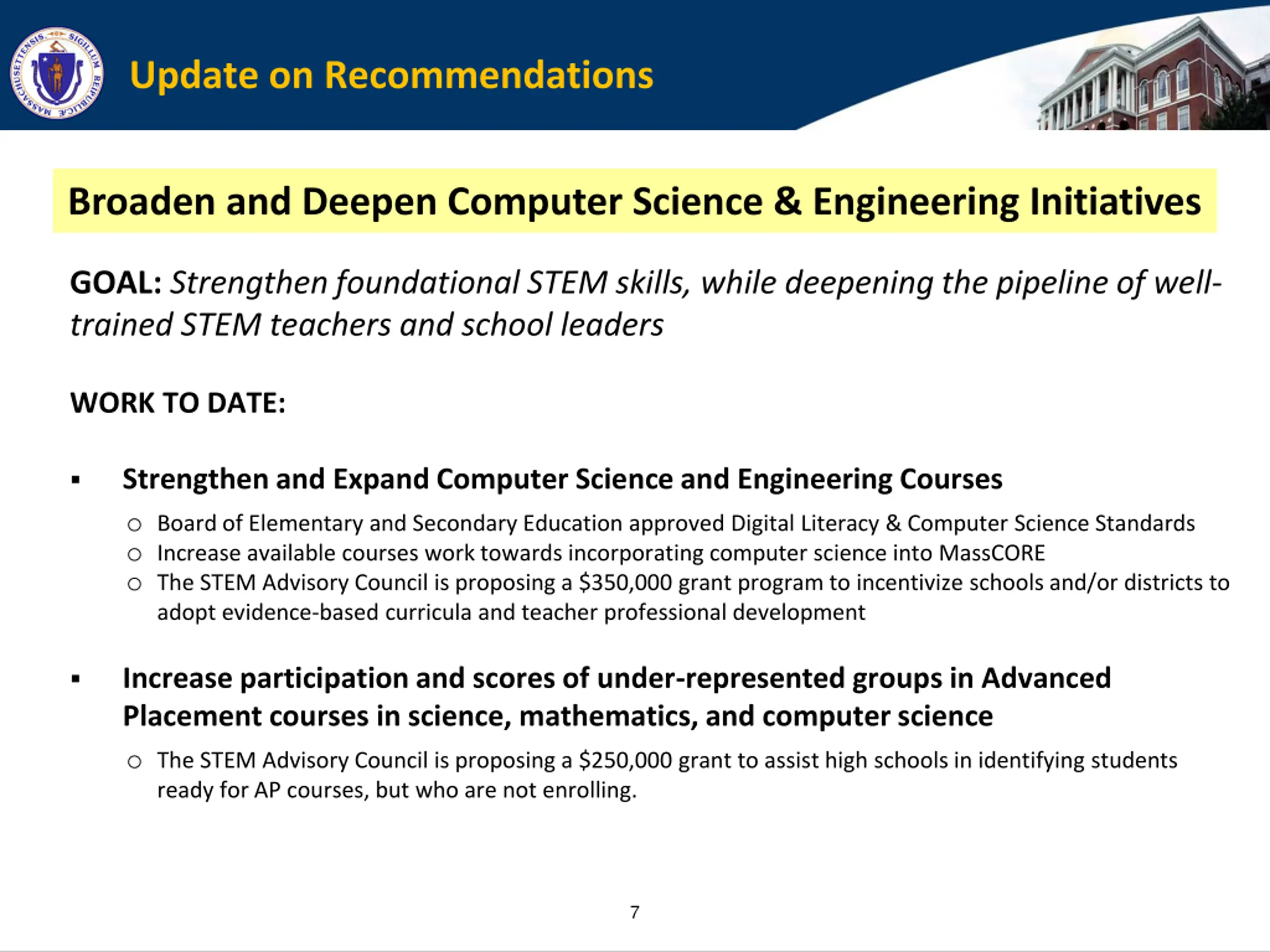 Update on Recommendations Broaden and Deepen Computer Science & Engineering Initiatives GOAL: Strengthen foundational STEM skills, while deepening the pipeline of well- trained STEM teachers and school leaders WORK TO DATE: Strengthen and Expand Computer Science and Engineering Courses o Board of Elementary and Secondary Education approved Digital Literacy & Computer Science Standards o Increase available courses work towards incorporating computer science into MassCORE o The STEM Advisory Council is proposing a $350,000 grant program to incentivize schools and/or districts to adopt evidence-based curricula and teacher professional development Increase participation and scores of under-represented groups in Advanced Placement courses in science, mathematics, and computer science o The STEM Advisory Council is proposing a $250,000 grant to assist high schools in identifying students ready for AP courses, but who are not enrolling. 7