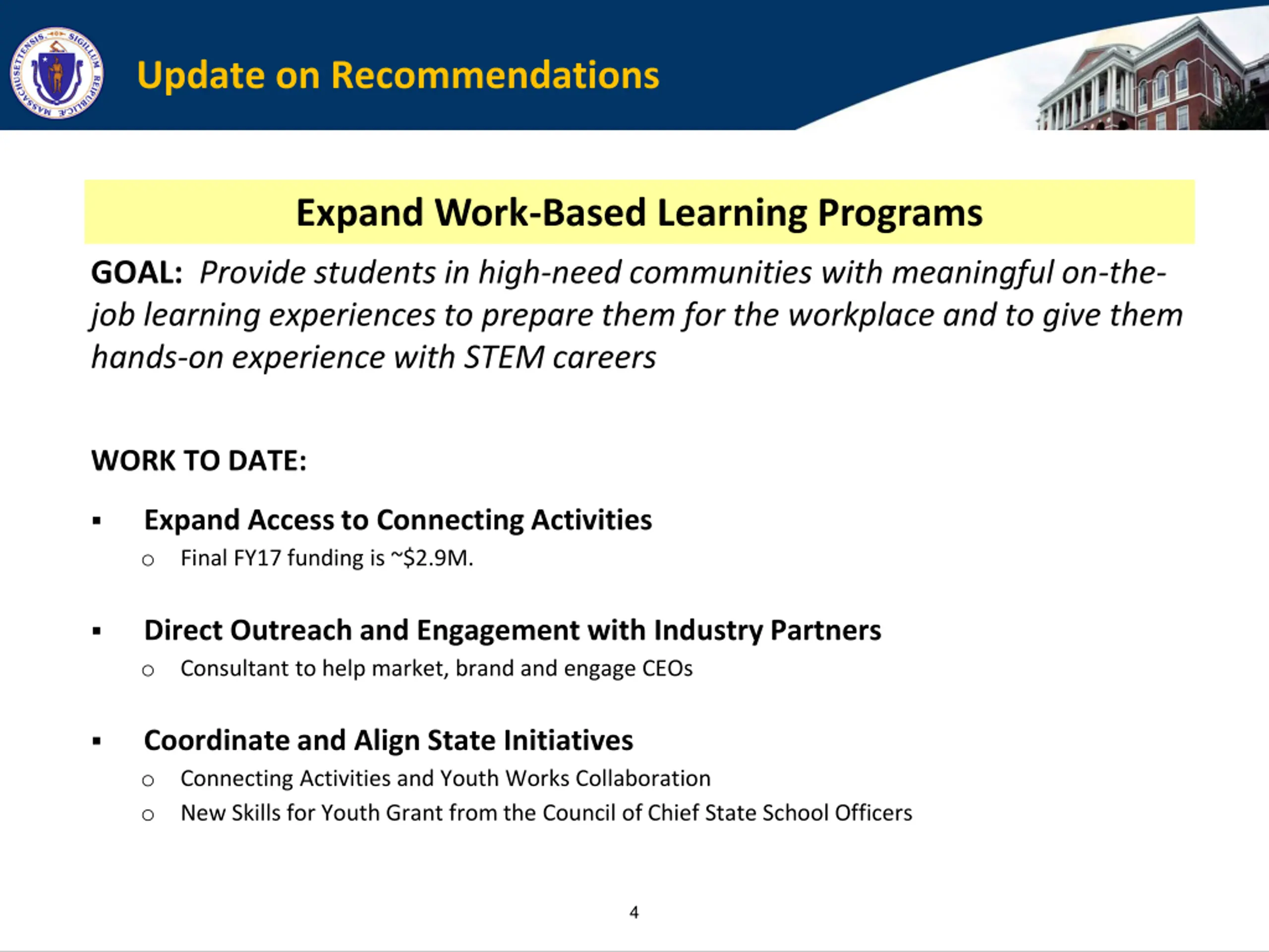 Update on Recommendations Expand Work-Based Learning Programs GOAL: Provide students in high-need communities with meaningful on-the- job learning experiences to prepare them for the workplace and to give them hands-on experience with STEM careers WORK TO DATE: Expand Access to Connecting Activities o Final FY17 funding is ~$2.9M. Direct Outreach and Engagement with Industry Partners o Consultant to help market, brand and engage CEOs Coordinate and Align State Initiatives o Connecting Activities and Youth Works Collaboration o New Skills for Youth Grant from the Council of Chief State School Officers 4
