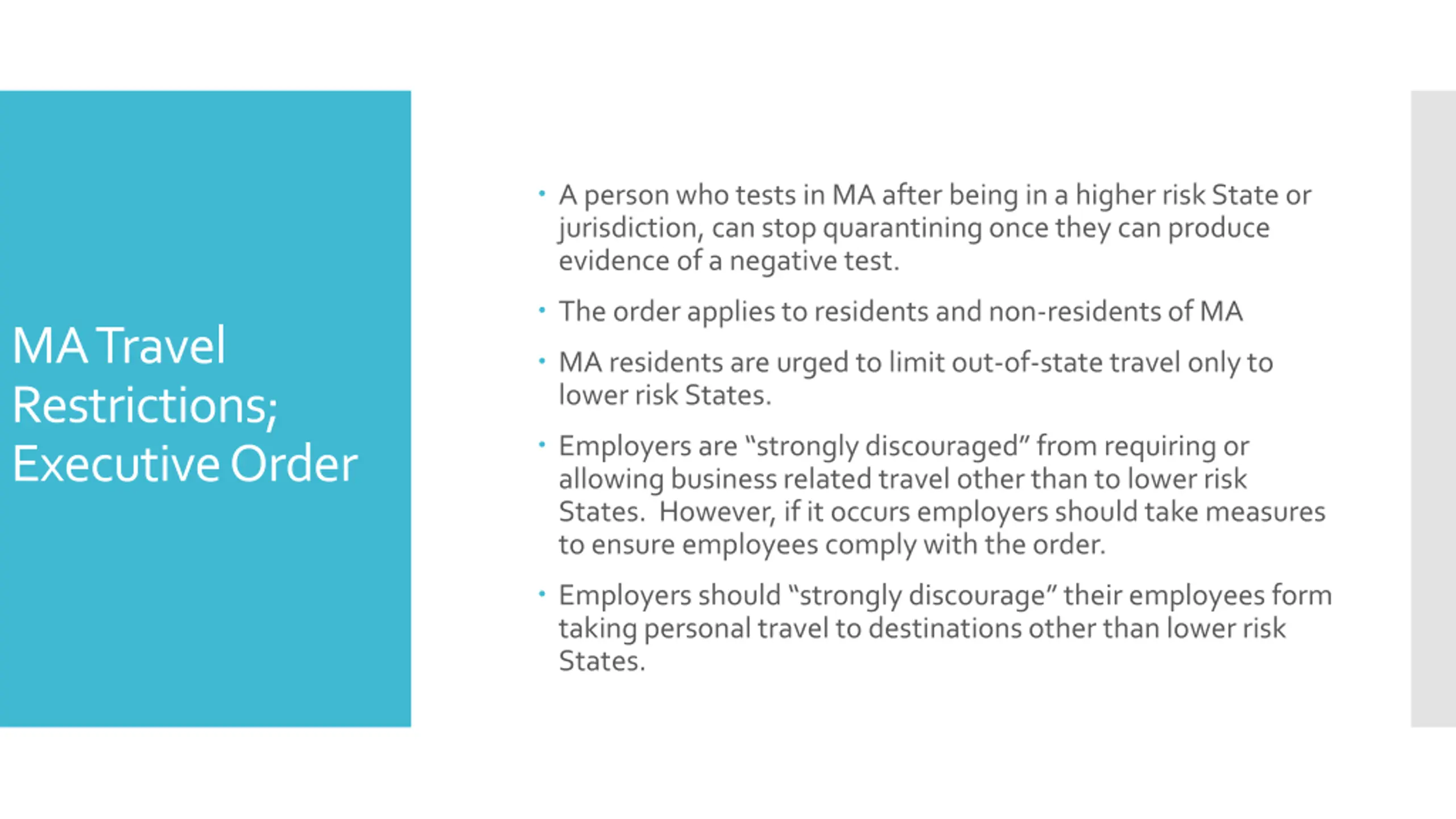 A person who tests in MA after being in a higher risk State or jurisdiction, can stop quarantining once they can produce evidence of a negative test. The order applies to residents and non-residents of MA MA Travel Restrictions; Executive Order MA residents are urged to limit out-of-state travel only to lower risk States. Employers are strongly discouraged from requiring or allowing business related travel other than to lower risk States. However, if it occurs employers should take measures to ensure employees comply with the order. Employers should strongly discourage their employees form taking personal travel to destinations other than lower risk States.