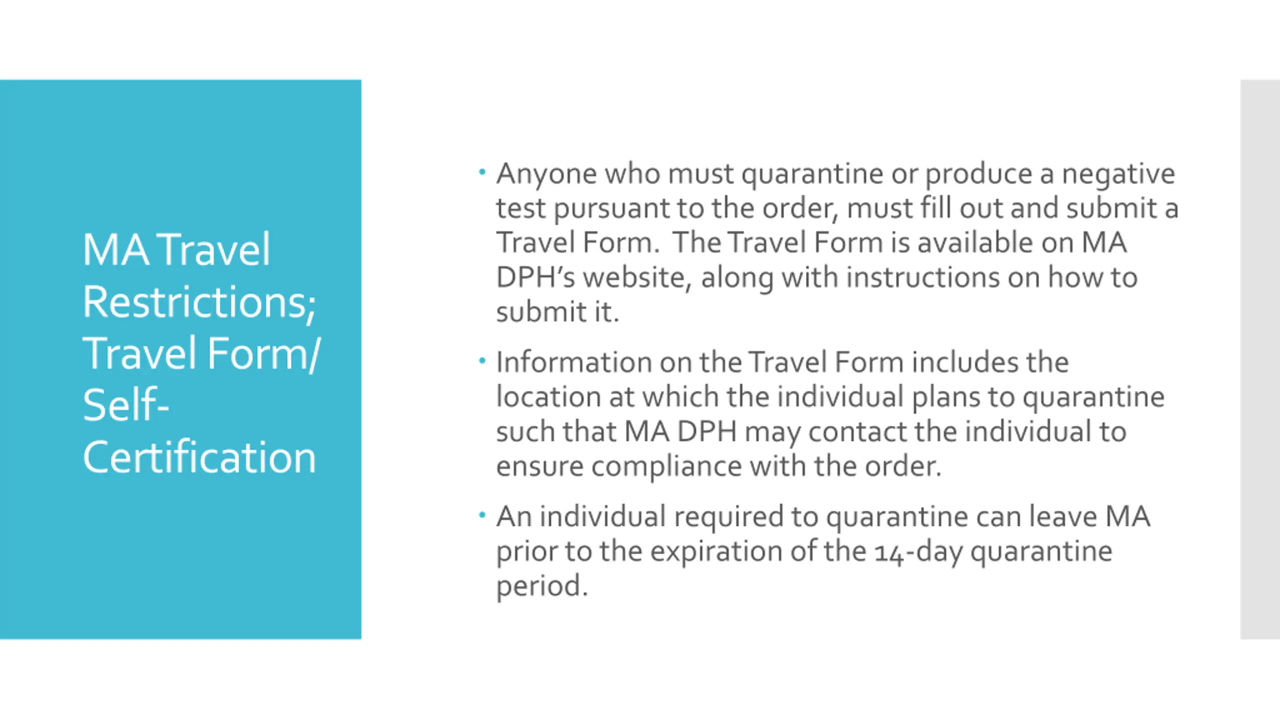 Anyone who must quarantine or produce a negative test pursuant to the order, must fill out and submit a Travel Form. The Travel Form is available on MA DPH s website, along with instructions on how to submit it. Information on the Travel Form includes the location at which the individual plans to quarantine such that MA DPH may contact the individual to ensure compliance with the order. An individual required to quarantine can leave MA prior to the expiration of the 14-day quarantine period. MA Travel Restrictions; Travel Form/ Self- Certification