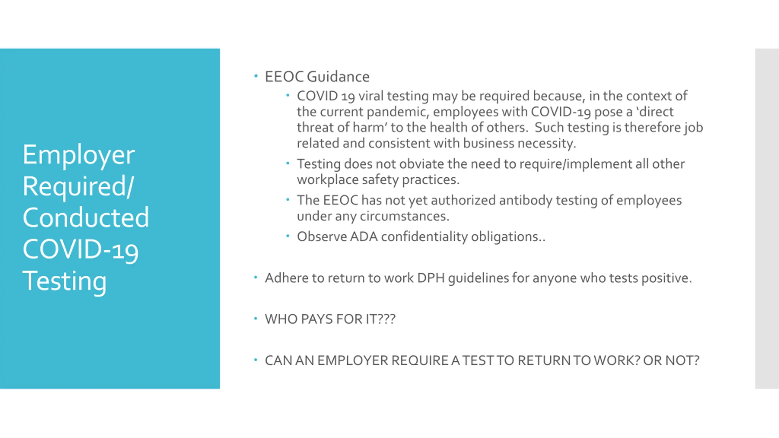 EEOC Guidance COVID 19 viral testing may be required because, in the context of the current pandemic, employees with COVID-19 pose a direct threat of harm to the health of others. Such testing is therefore job related and consistent with business necessity. Testing does not obviate the need to require/implement all other workplace safety practices. The EEOC has not yet authorized antibody testing of employees under any circumstances. Observe ADA confidentiality obligations.. Employer Required/ Conducted COVID-19 Testing Adhere to return to work DPH guidelines for anyone who tests positive. WHO PAYS FOR IT??? CAN AN EMPLOYER REQUIRE A TEST TO RETURN TO WORK? OR NOT?