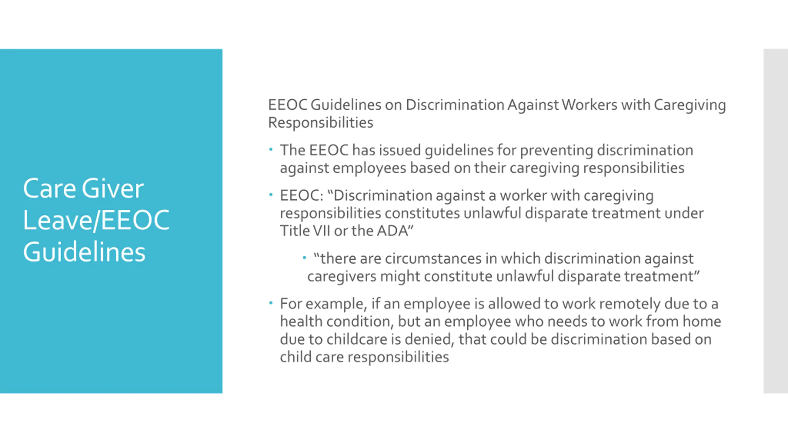 EEOC Guidelines on Discrimination Against Workers with Caregiving Responsibilities The EEOC has issued guidelines for preventing discrimination against employees based on their caregiving responsibilities Care Giver Leave/EEOC Guidelines EEOC: Discrimination against a worker with caregiving responsibilities constitutes unlawful disparate treatment under Title VII or the ADA there are circumstances in which discrimination against caregivers might constitute unlawful disparate treatment For example, if an employee is allowed to work remotely due to a health condition, but an employee who needs to work from home due to childcare is denied, that could be discrimination based on child care responsibilities