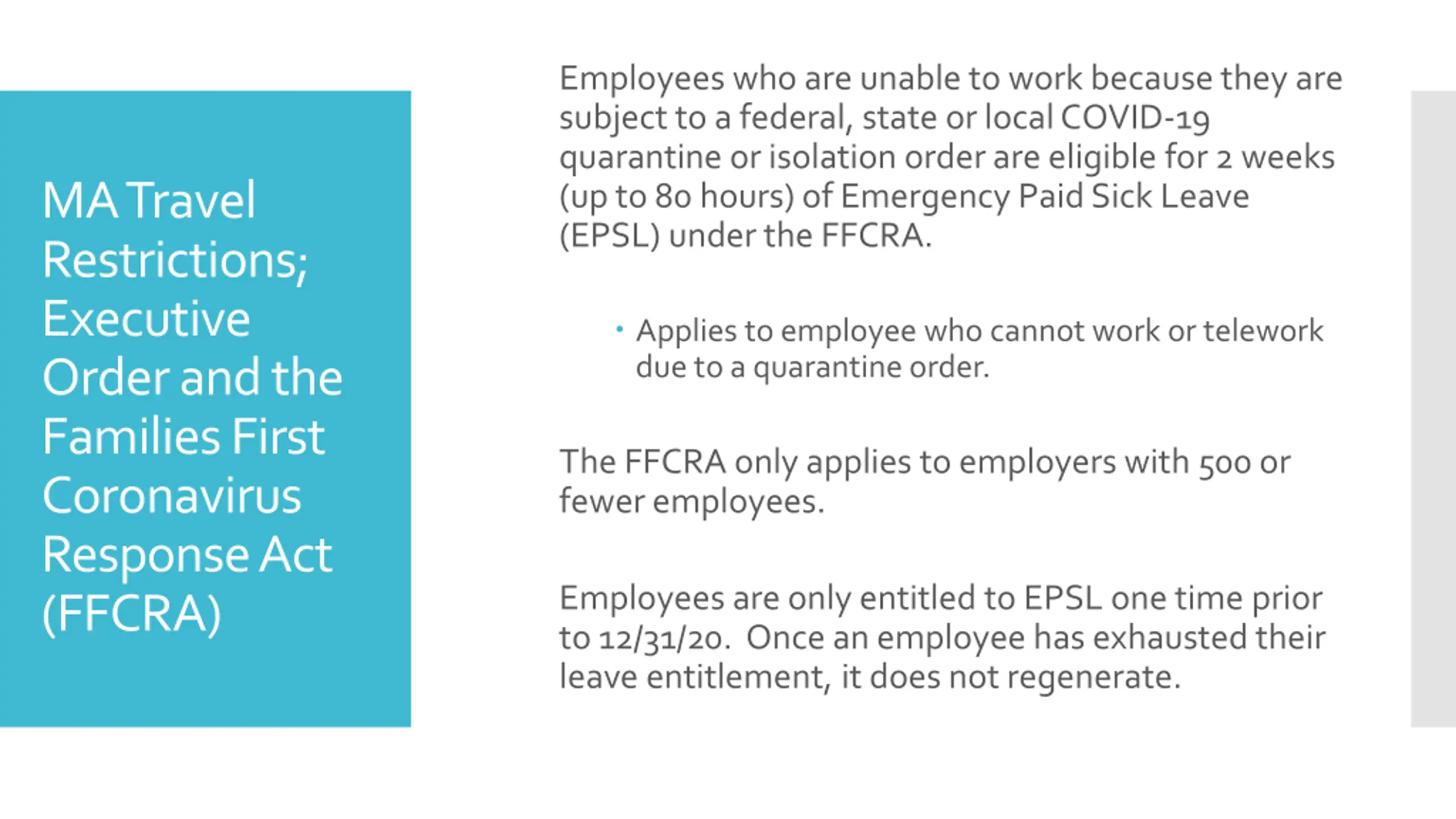 Employees who are unable to work because they are subject to a federal, state or local COVID-19 quarantine or isolation order are eligible for 2 weeks (up to 80 hours) of Emergency Paid Sick Leave (EPSL) under the FFCRA. MA Travel Restrictions; Executive Order and the Families First Coronavirus Response Act (FFCRA) Applies to employee who cannot work or telework due to a quarantine order. The FFCRA only applies to employers with 500 or fewer employees. Employees are only entitled to EPSL one time prior to 12/31/20. Once an employee has exhausted their leave entitlement, it does not regenerate.