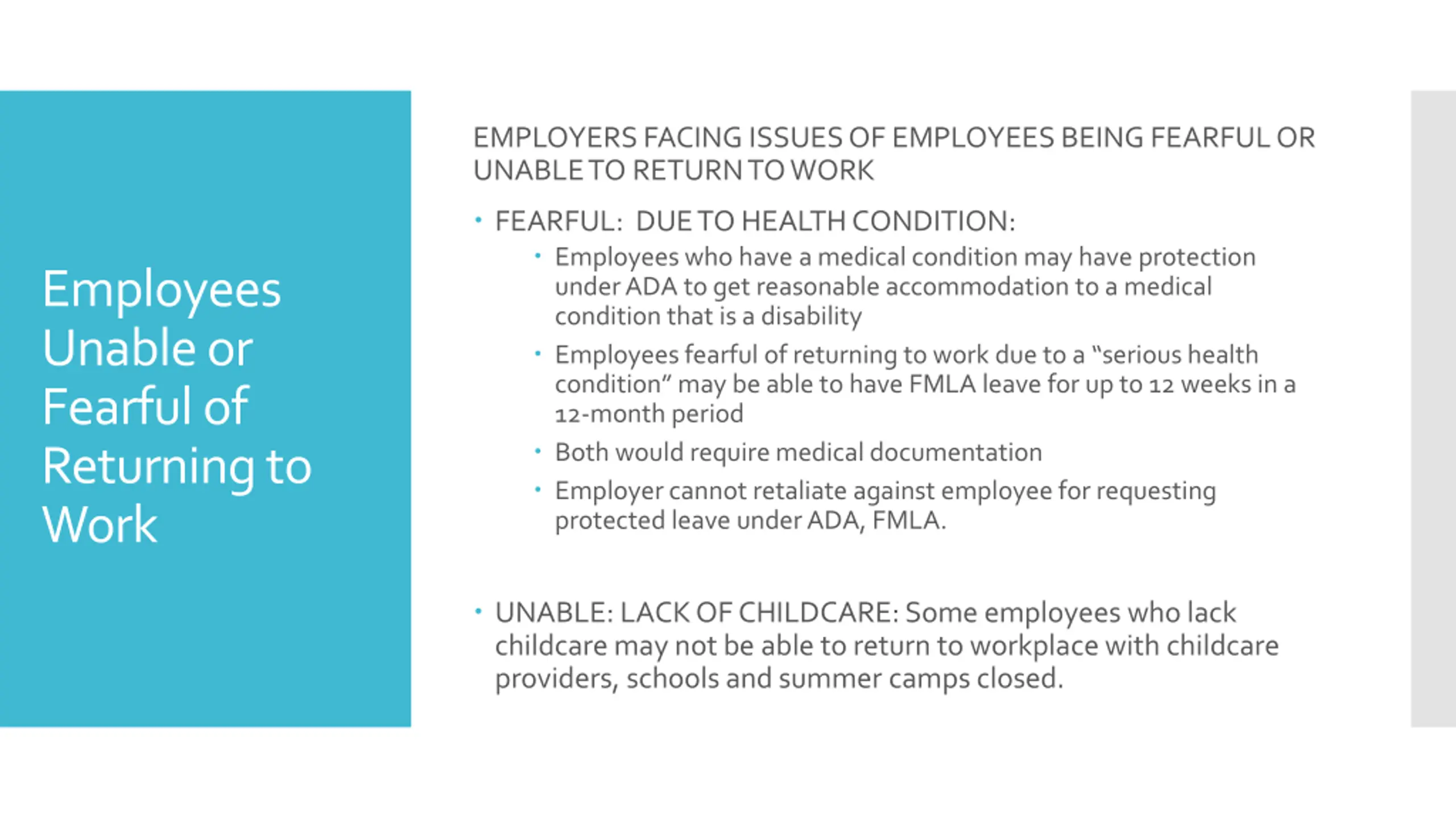 EMPLOYERS FACING ISSUES OF EMPLOYEES BEING FEARFUL OR UNABLE TO RETURN TO WORK FEARFUL: DUE TO HEALTH CONDITION: Employees who have a medical condition may have protection under ADA to get reasonable accommodation to a medical condition that is a disability Employees fearful of returning to work due to a serious health condition may be able to have FMLA leave for up to 12 weeks in a 12-month period Both would require medical documentation Employer cannot retaliate against employee for requesting protected leave under ADA, FMLA. Employees Unable or Fearful of Returning to Work UNABLE: LACK OF CHILDCARE: Some employees who lack childcare may not be able to return to workplace with childcare providers, schools and summer camps closed.