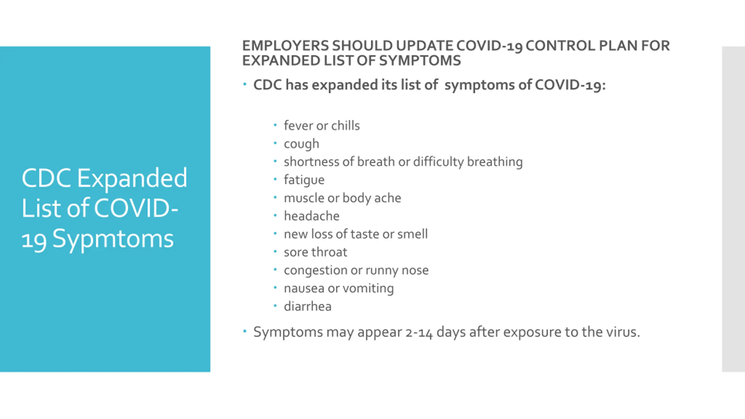 EMPLOYERS SHOULD UPDATE COVID-19 CONTROL PLAN FOR EXPANDED LIST OF SYMPTOMS CDC has expanded its list of symptoms of COVID-19: fever or chills cough shortness of breath or difficulty breathing fatigue muscle or body ache headache new loss of taste or smell sore throat congestion or runny nose nausea or vomiting diarrhea CDC Expanded List of COVID- 19 Sypmtoms Symptoms may appear 2-14 days after exposure to the virus.