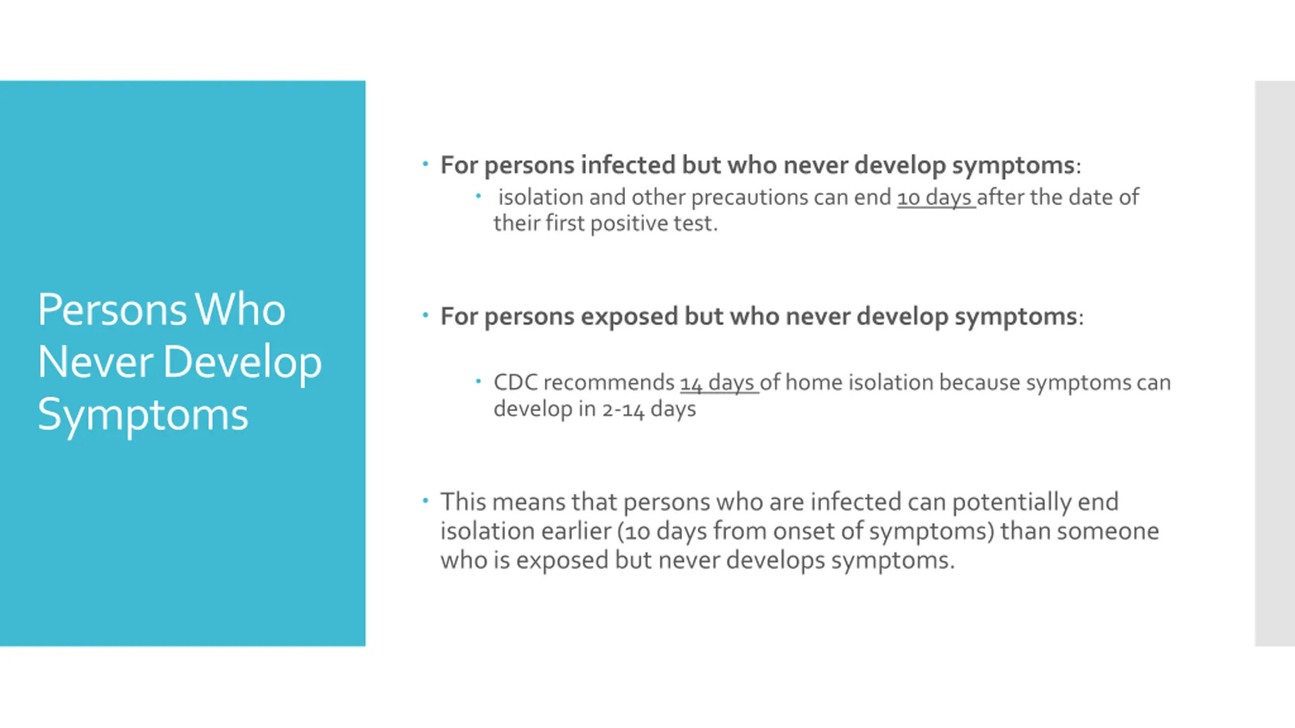 For persons infected but who never develop symptoms: isolation and other precautions can end 10 days after the date of their first positive test. Persons Who Never Develop Symptoms For persons exposed but who never develop symptoms: CDC recommends 14 days of home isolation because symptoms can develop in 2-14 days This means that persons who are infected can potentially end isolation earlier (10 days from onset of symptoms) than someone who is exposed but never develops symptoms.
