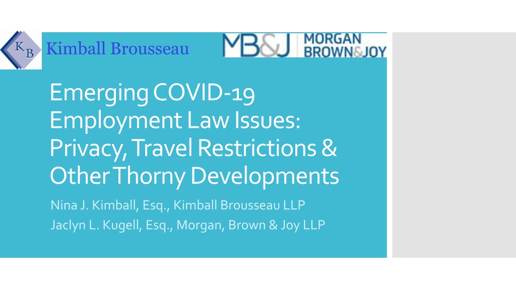 Kimball Brousseau Emerging COVID-19 Employment Law Issues: Privacy, Travel Restrictions & Other Thorny Developments Nina J. Kimball, Esq., Kimball Brousseau LLP Jaclyn L. Kugell, Esq., Morgan, Brown & Joy LLP