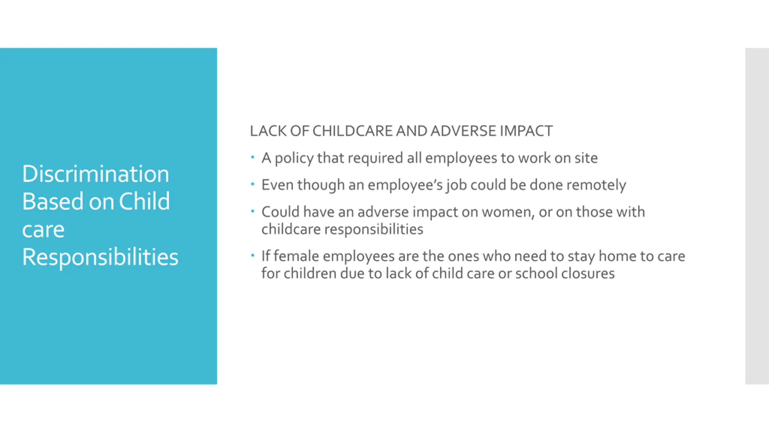LACK OF CHILDCARE AND ADVERSE IMPACT A policy that required all employees to work on site Discrimination Based on Child care Responsibilities Even though an employee s job could be done remotely Could have an adverse impact on women, or on those with childcare responsibilities If female employees are the ones who need to stay home to care for children due to lack of child care or school closures