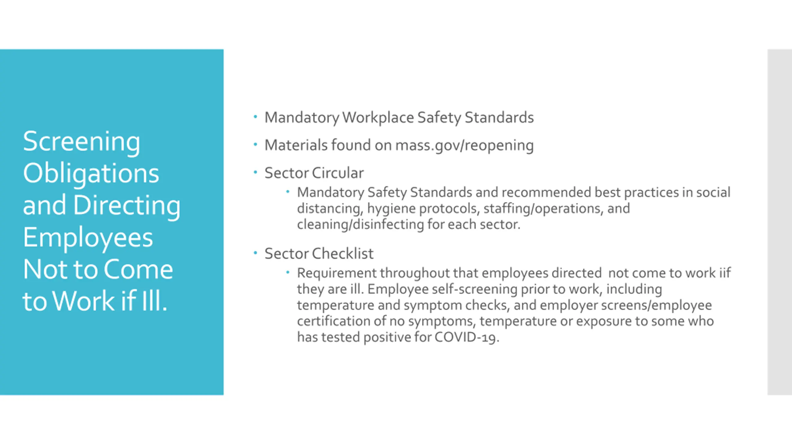 Mandatory Workplace Safety Standards Screening Obligations and Directing Employees Not to Come to Work if Ill. Materials found on mass.gov/reopening Sector Circular Mandatory Safety Standards and recommended best practices in social distancing, hygiene protocols, staffing/operations, and cleaning/disinfecting for each sector. Sector Checklist Requirement throughout that employees directed not come to work iif they are ill. Employee self-screening prior to work, including temperature and symptom checks, and employer screens/employee certification of no symptoms, temperature or exposure to some who has tested positive for COVID-19.