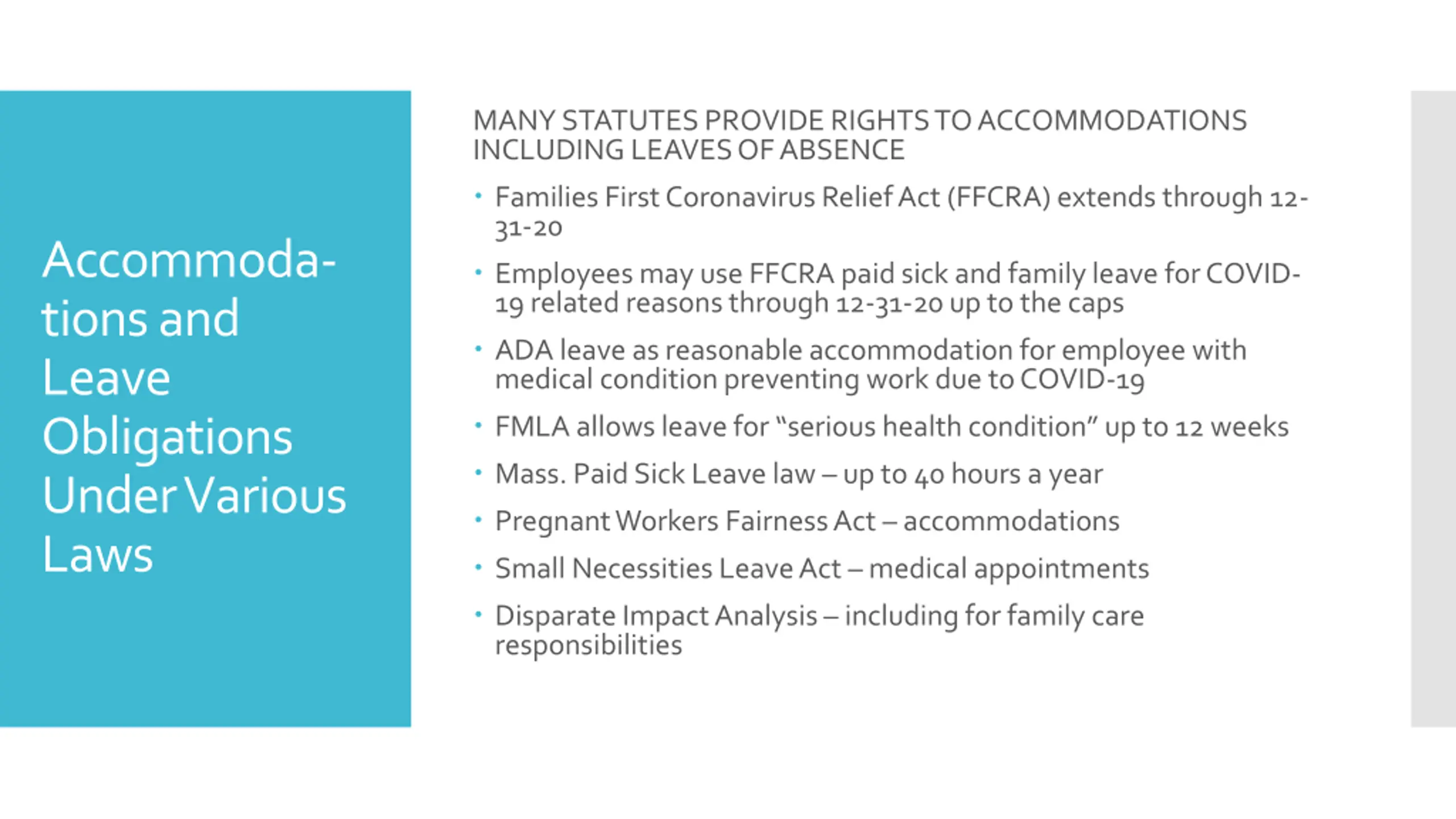 MANY STATUTES PROVIDE RIGHTS TO ACCOMMODATIONS INCLUDING LEAVES OF ABSENCE Families First Coronavirus Relief Act (FFCRA) extends through 12- 31-20 Employees may use FFCRA paid sick and family leave for COVID- 19 related reasons through 12-31-20 up to the caps ADA leave as reasonable accommodation for employee with medical condition preventing work due to COVID-19 FMLA allows leave for serious health condition up to 12 weeks Mass. Paid Sick Leave law up to 40 hours a year Pregnant Workers Fairness Act accommodations Small Necessities Leave Act medical appointments Disparate Impact Analysis including for family care responsibilities Accommoda- tions and Leave Obligations Under Various Laws